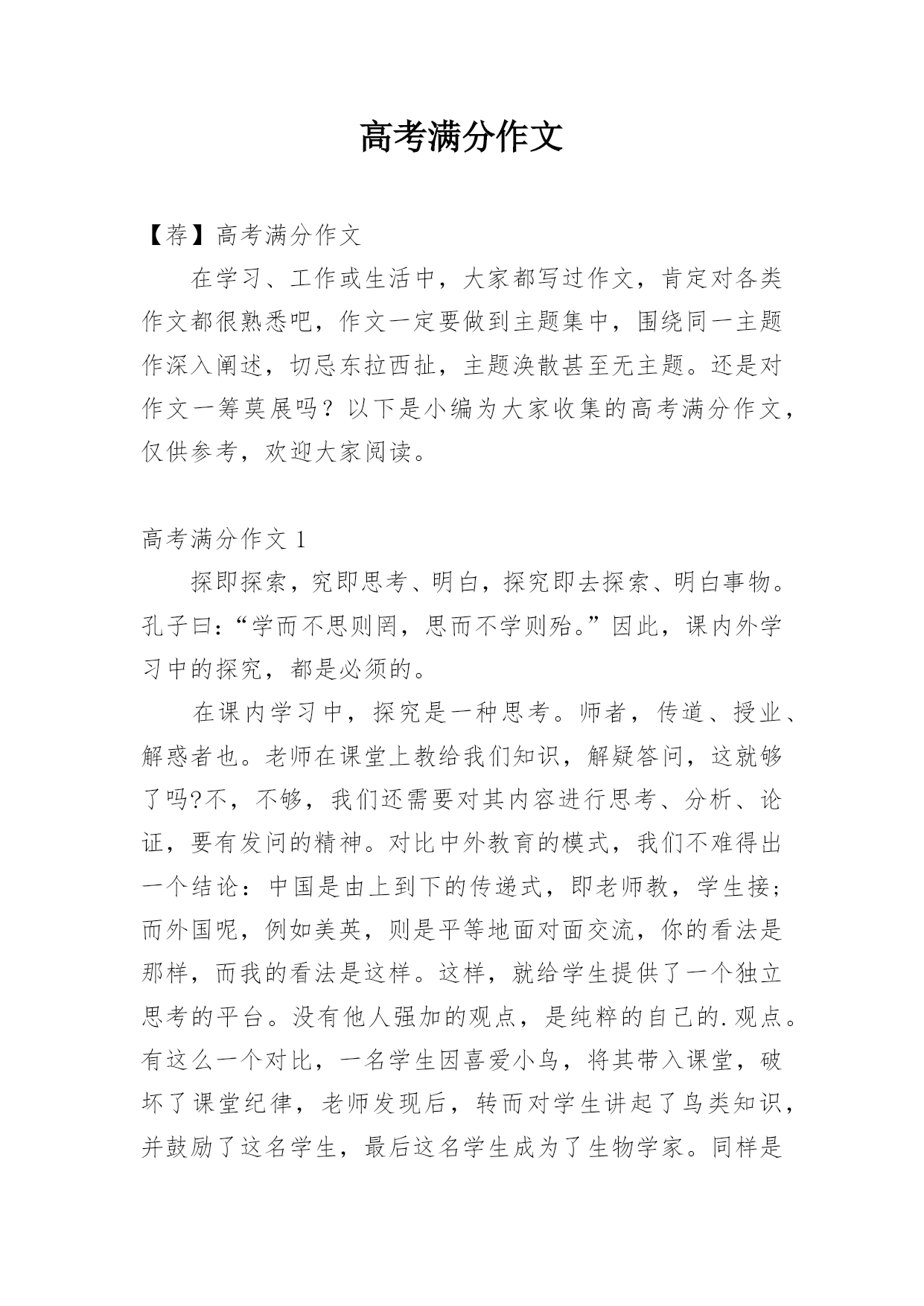 高考满分作文【荐】高考满分作文在学习、工作或生活中,大家都写过作文,肯定对各类作文都很熟悉吧,作文一定要做到主题集中,围绕同一主题作深入阐述,切忌东拉西扯,主题涣散甚至无主题。还是对作文一筹莫展吗?以下是小编为大家收集的高考满分作文,仅供参考,欢迎大家阅读。高考满分作文1探即探索,究即思考、明白,探究即去探索、明白事物。孔子曰:“学而不思则罔,思而不学则殆。”因此,课内外学习中的探究,都是必须的。在课内学习中,探究是一种思考。师者,传道、授业、解惑者也。老师在课堂上教给我们知识,解疑答问,这就够了吗?不,