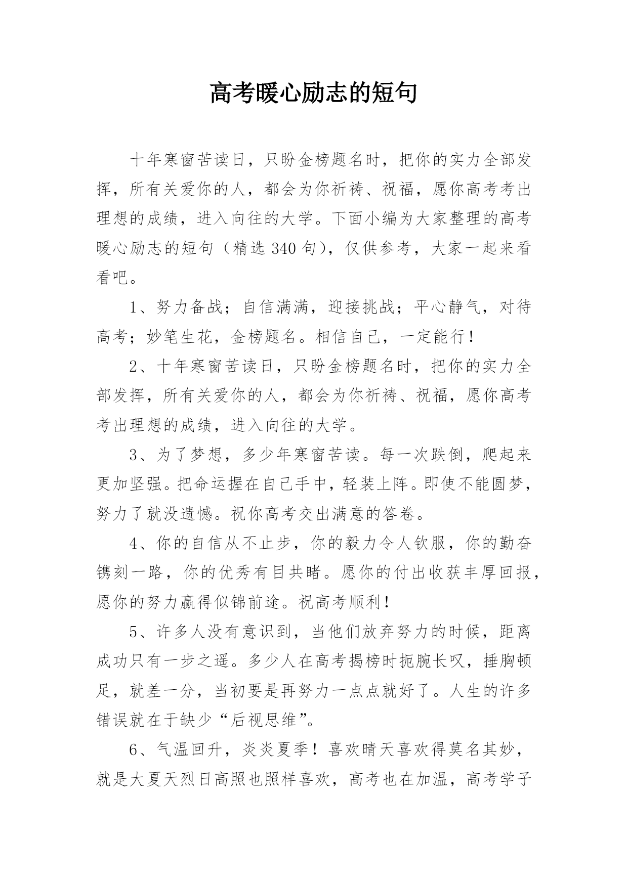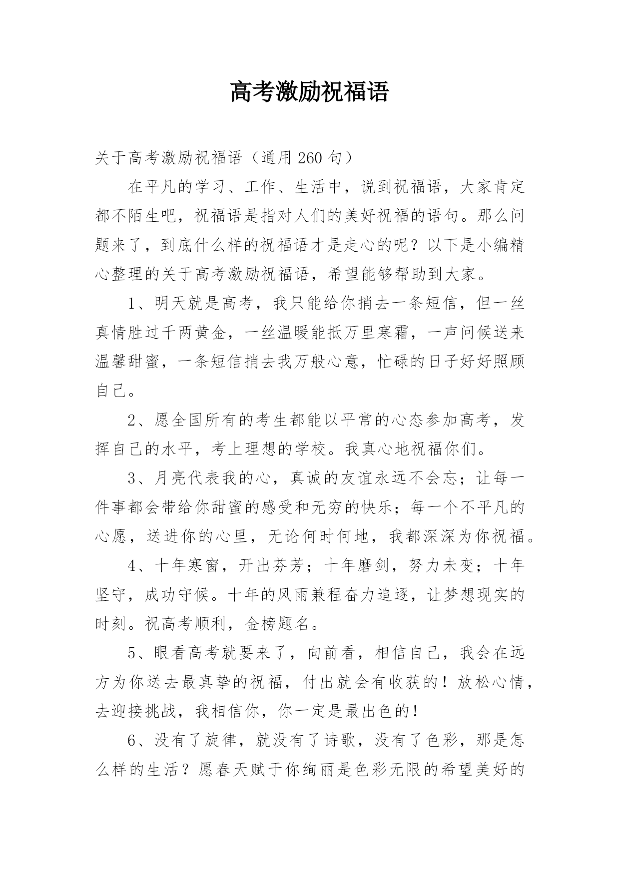 高考激励祝福语关于高考激励祝福语(通用260句)在平凡的学习、工作、生活中,说到祝福语,大家肯定都不陌生吧,祝福语是指对人们的美好祝福的语句。那么问题来了,到底什么样的祝福语才是走心的呢?以下是小编精心整理的关于高考激励祝福语,希望能够帮助到大家。1、明天就是高考,我只能给你捎去一条短信,但一丝真情胜过千两黄金,一丝温暖能抵万里寒霜,一声问候送来温馨甜蜜,一条短信捎去我万般心意,忙碌的日子好好照顾自己。2、愿全国所有的考生都能以平常的心态参加高考,发挥自己的水平,考上理想的学校。我真心地祝福你们。3、月亮