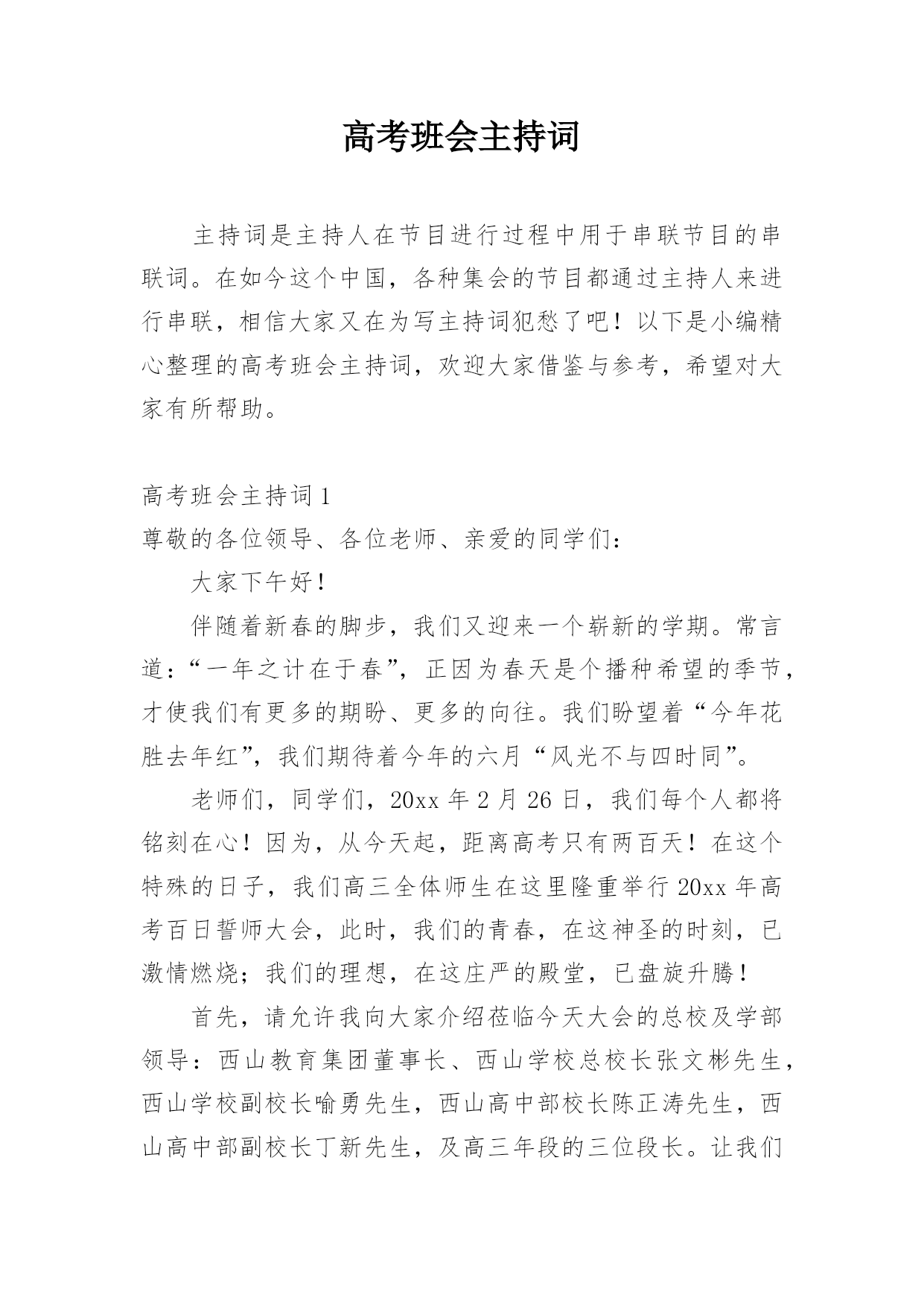 高考班会主持词主持词是主持人在节目进行过程中用于串联节目的串联词。在如今这个中国,各种集会的节目都通过主持人来进行串联,相信大家又在为写主持词犯愁了吧!以下是小编精心整理的高考班会主持词,欢迎大家借鉴与参考,希望对大家有所帮助。高考班会主持词1尊敬的各位领导、各位老师、亲爱的同学们:大家下午好!伴随着新春的脚步,我们又迎来一个崭新的学期。常言道:“一年之计在于春”,正因为春天是个播种希望的季节,才使我们有更多的期盼、更多的向往。我们盼望着“今年花胜去年红”,我们期待着今年的六月“风光不与四时同”。老师们,
