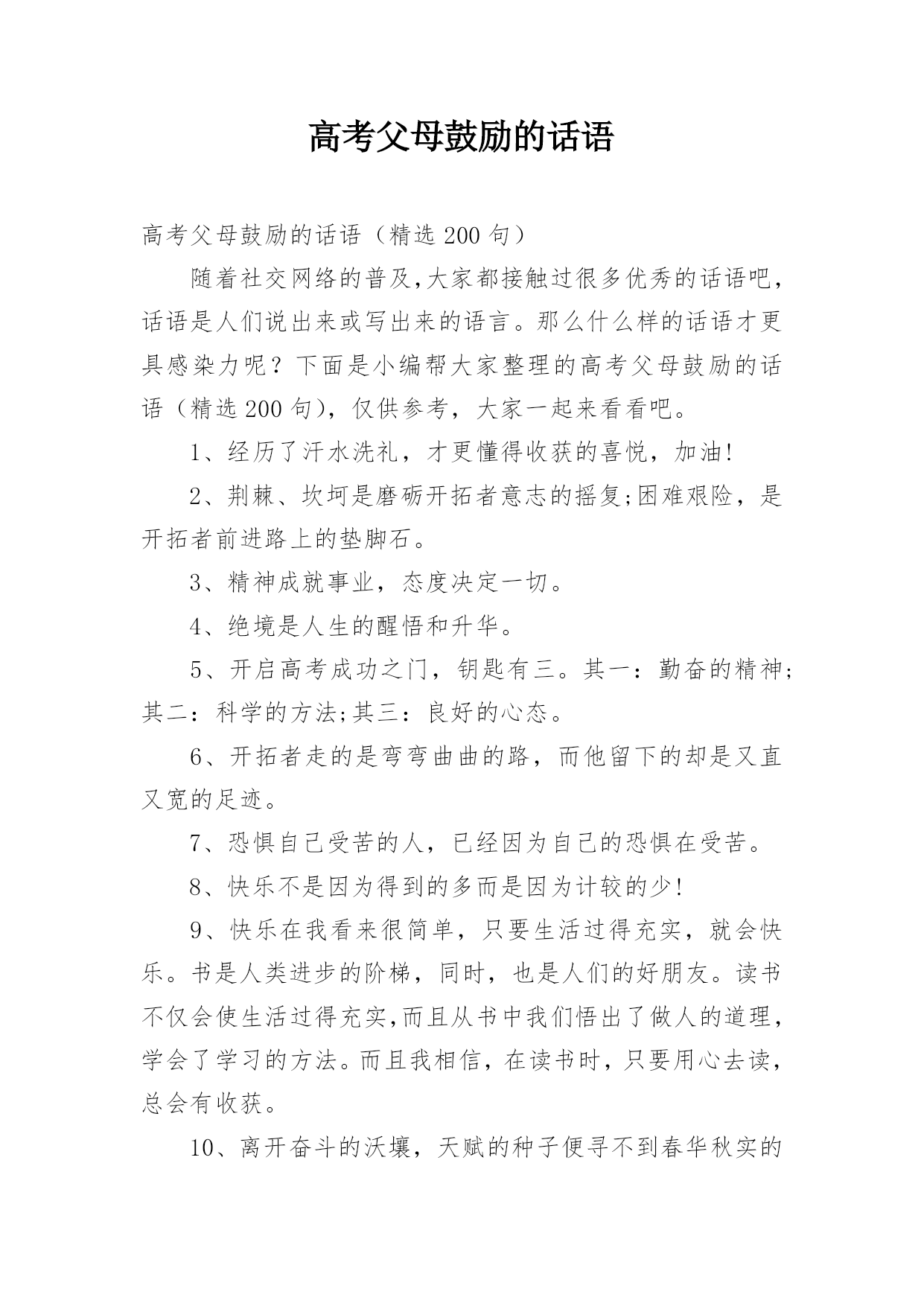 高考父母鼓励的话语高考父母鼓励的话语(精选200句)随着社交网络的普及,大家都接触过很多优秀的话语吧,话语是人们说出来或写出来的语言。那么什么样的话语才更具感染力呢?下面是小编帮大家整理的高考父母鼓励的话语(精选200句),仅供参考,大家一起来看看吧。1、经历了汗水洗礼,才更懂得收获的喜悦,加油!2、荆棘、坎坷是磨砺开拓者意志的摇复;困难艰险,是开拓者前进路上的垫脚石。3、精神成就事业,态度决定一切。4、绝境是人生的醒悟和升华。5、开启高考成功之门,钥匙有三。其一:勤奋的精神;其二:科学的方法;其三:良好