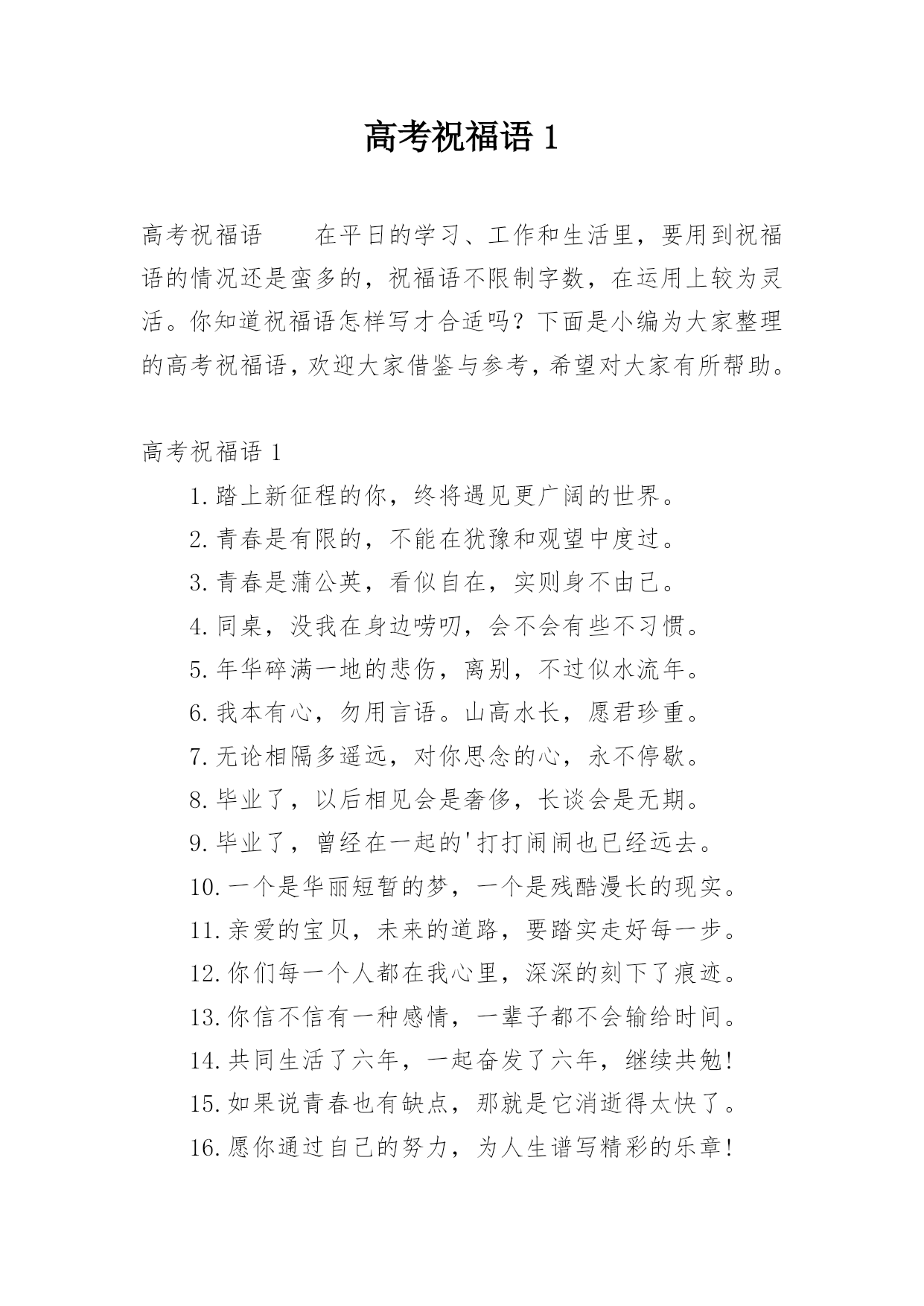 高考祝福语1高考祝福语在平日的学习、工作和生活里,要用到祝福语的情况还是蛮多的,祝福语不限制字数,在运用上较为灵活。你知道祝福语怎样写才合适吗?下面是小编为大家整理的高考祝福语,欢迎大家借鉴与参考,希望对大家有所帮助。高考祝福语11.踏上新征程的你,终将遇见更广阔的世界。2.青春是有限的,不能在犹豫和观望中度过。3.青春是蒲公英,看似自在,实则身不由己。4.同桌,没我在身边唠叨,会不会有些不习惯。5.年华碎满一地的悲伤,离别,不过似水流年。6.我本有心,勿用言语。山高水长,愿君珍重。7.无论相隔多遥远,对
