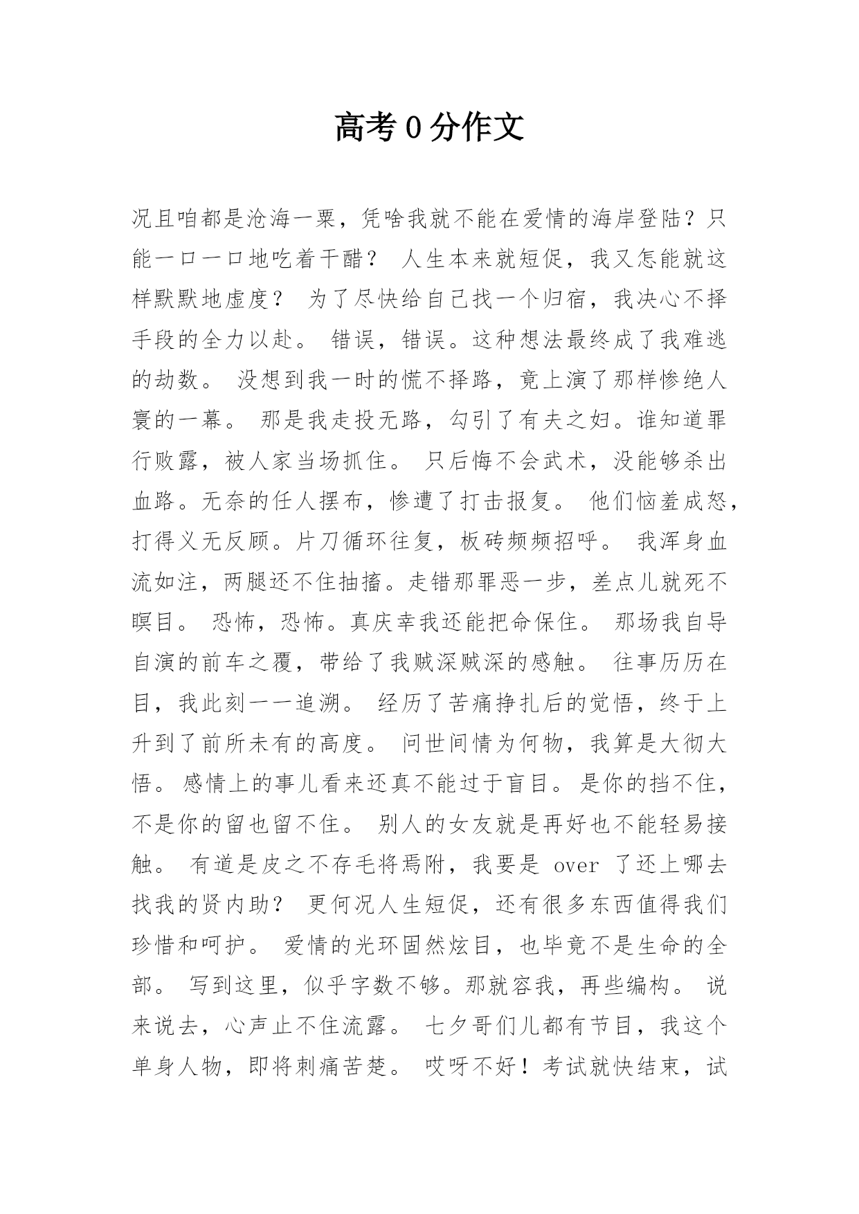 高考0分作文况且咱都是沧海一粟,凭啥我就不能在爱情的海岸登陆?只能一口一口地吃着干醋?人生本来就短促,我又怎能就这样默默地虚度?为了尽快给自己找一个归宿,我决心不择手段的全力以赴。错误,错误。这种想法最终成了我难逃的劫数。没想到我一时的慌不择路,竟上演了那样惨绝人寰的一幕。那是我走投无路,勾引了有夫之妇。谁知道罪行败露,被人家当场抓住。只后悔不会武术,没能够杀出血路。无奈的任人摆布,惨遭了打击报复。他们恼羞成怒,打得义无反顾。片刀循环往复,板砖频频招呼。我浑身血流如注,两腿还不住抽搐。走错那罪恶一步,差点