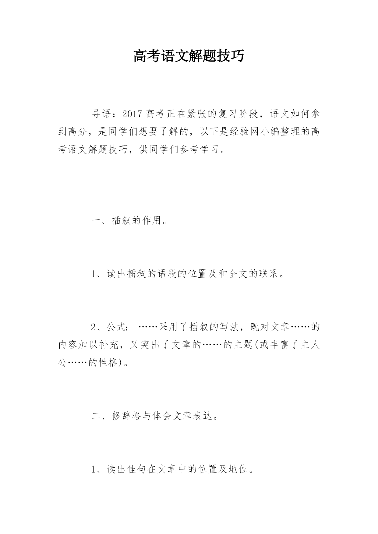 高考语文解题技巧导语:2017高考正在紧张的复习阶段,语文如何拿到高分,是同学们想要了解的,以下是经验网小编整理的高考语文解题技巧,供同学们参考学习。一、插叙的作用。1、读出插叙的语段的位置及和全文的联系。2、公式:……采用了插叙的写法,既对文章……的内容加以补充,又突出了文章的……的主题(或丰富了主人公……的性格)。二、修辞格与体会文章表达。1、读出佳句在文章中的位置及地位。2、公式:①比喻:……采用了比喻的修辞手法,地描写了……,表现了作者对……的感情,形象生动。②拟人:……采用了拟人的修辞手法,将…