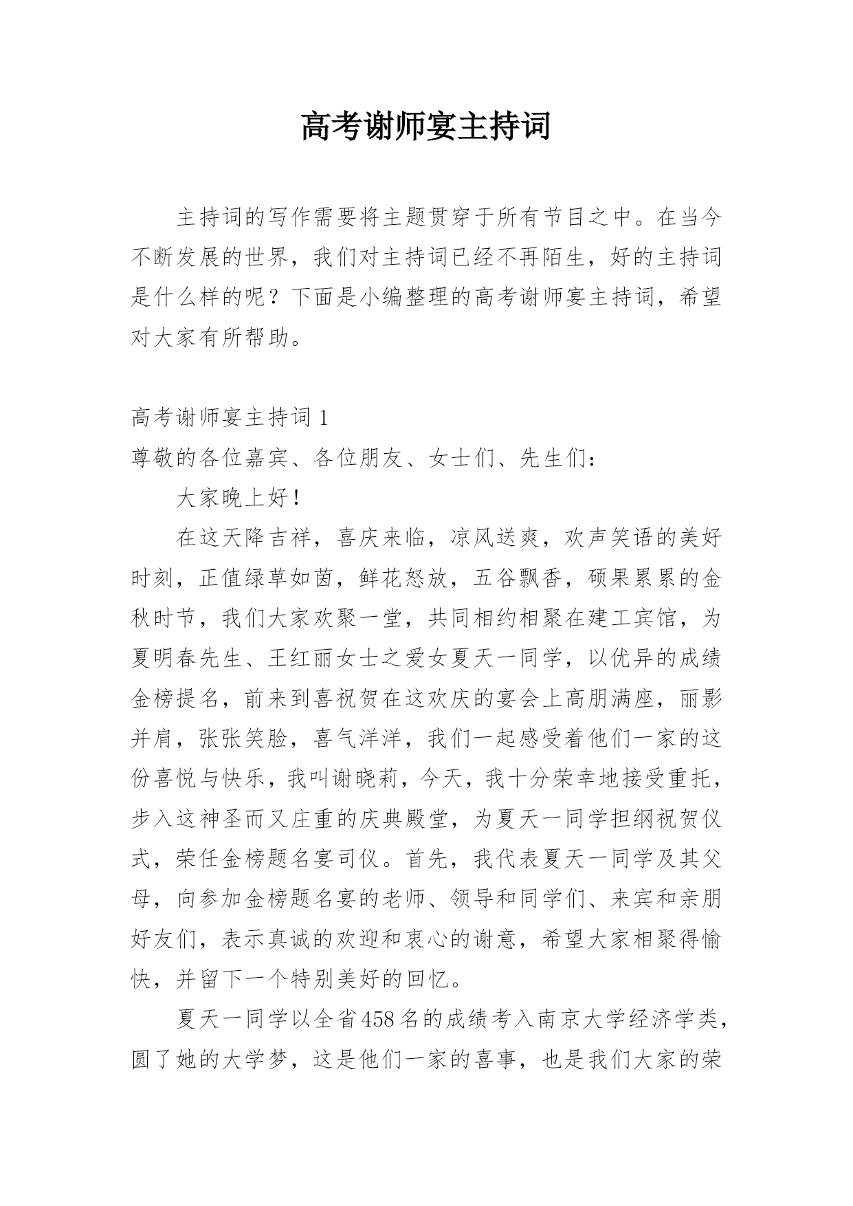 高考谢师宴主持词主持词的写作需要将主题贯穿于所有节目之中。在当今不断发展的世界,我们对主持词已经不再陌生,好的主持词是什么样的呢?下面是小编整理的高考谢师宴主持词,希望对大家有所帮助。高考谢师宴主持词1尊敬的各位嘉宾、各位朋友、女士们、先生们:大家晚上好!在这天降吉祥,喜庆来临,凉风送爽,欢声笑语的美好时刻,正值绿草如茵,鲜花怒放,五谷飘香,硕果累累的金秋时节,我们大家欢聚一堂,共同相约相聚在建工宾馆,为夏明春先生、王红丽女士之爱女夏天一同学,以优异的成绩金榜提名,前来到喜祝贺在这欢庆的宴会上高朋满座,丽