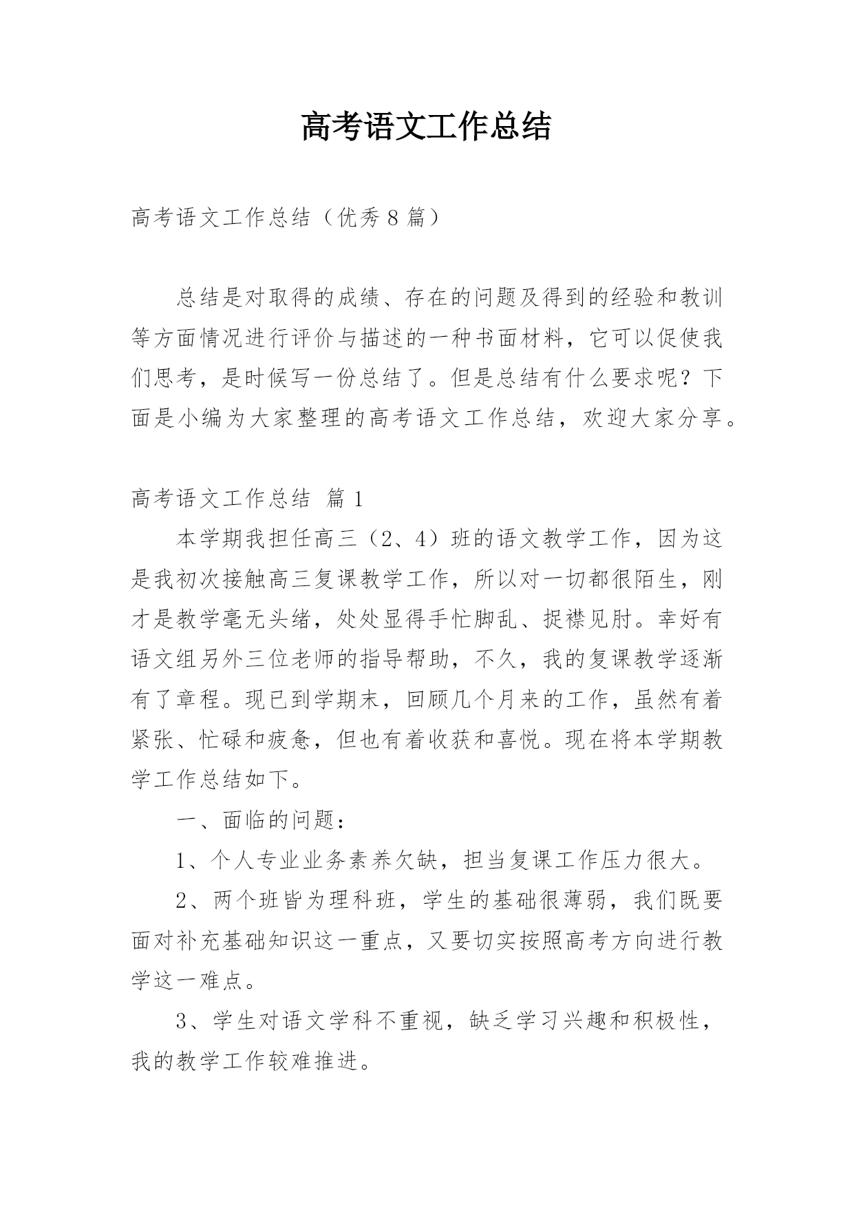 高考语文工作总结高考语文工作总结(优秀8篇)总结是对取得的成绩、存在的问题及得到的经验和教训等方面情况进行评价与描述的一种书面材料,它可以促使我们思考,是时候写一份总结了。但是总结有什么要求呢?下面是小编为大家整理的高考语文工作总结,欢迎大家分享。高考语文工作总结篇1本学期我担任高三(2、4)班的语文教学工作,因为这是我初次接触高三复课教学工作,所以对一切都很陌生,刚才是教学毫无头绪,处处显得手忙脚乱、捉襟见肘。幸好有语文组另外三位老师的指导帮助,不久,我的复课教学逐渐有了章程。现已到学期末,回顾几个月来
