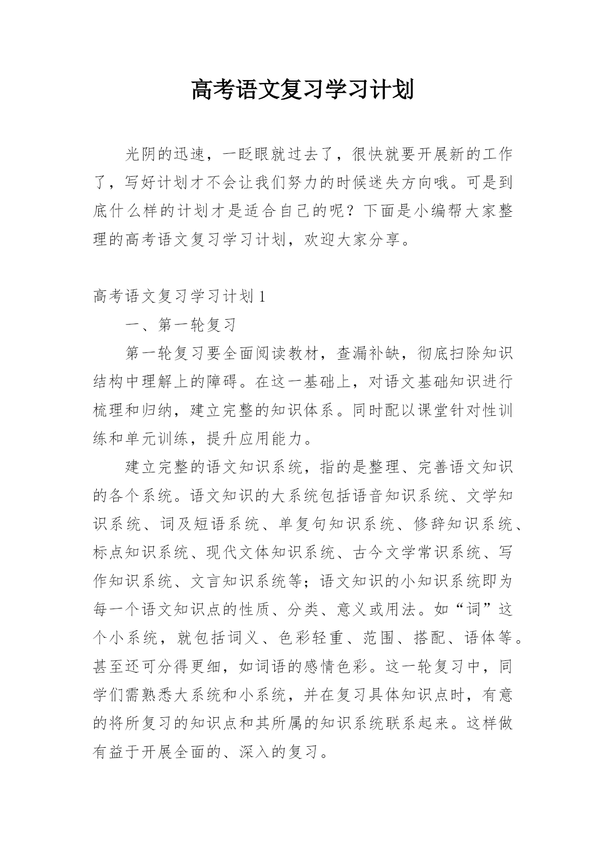 高考语文复习学习计划光阴的迅速,一眨眼就过去了,很快就要开展新的工作了,写好计划才不会让我们努力的时候迷失方向哦。可是到底什么样的计划才是适合自己的呢?下面是小编帮大家整理的高考语文复习学习计划,欢迎大家分享。高考语文复习学习计划1一、第一轮复习第一轮复习要全面阅读教材,查漏补缺,彻底扫除知识结构中理解上的障碍。在这一基础上,对语文基础知识进行梳理和归纳,建立完整的知识体系。同时配以课堂针对性训练和单元训练,提升应用能力。建立完整的语文知识系统,指的是整理、完善语文知识的各个系统。语文知识的大系统包括语音