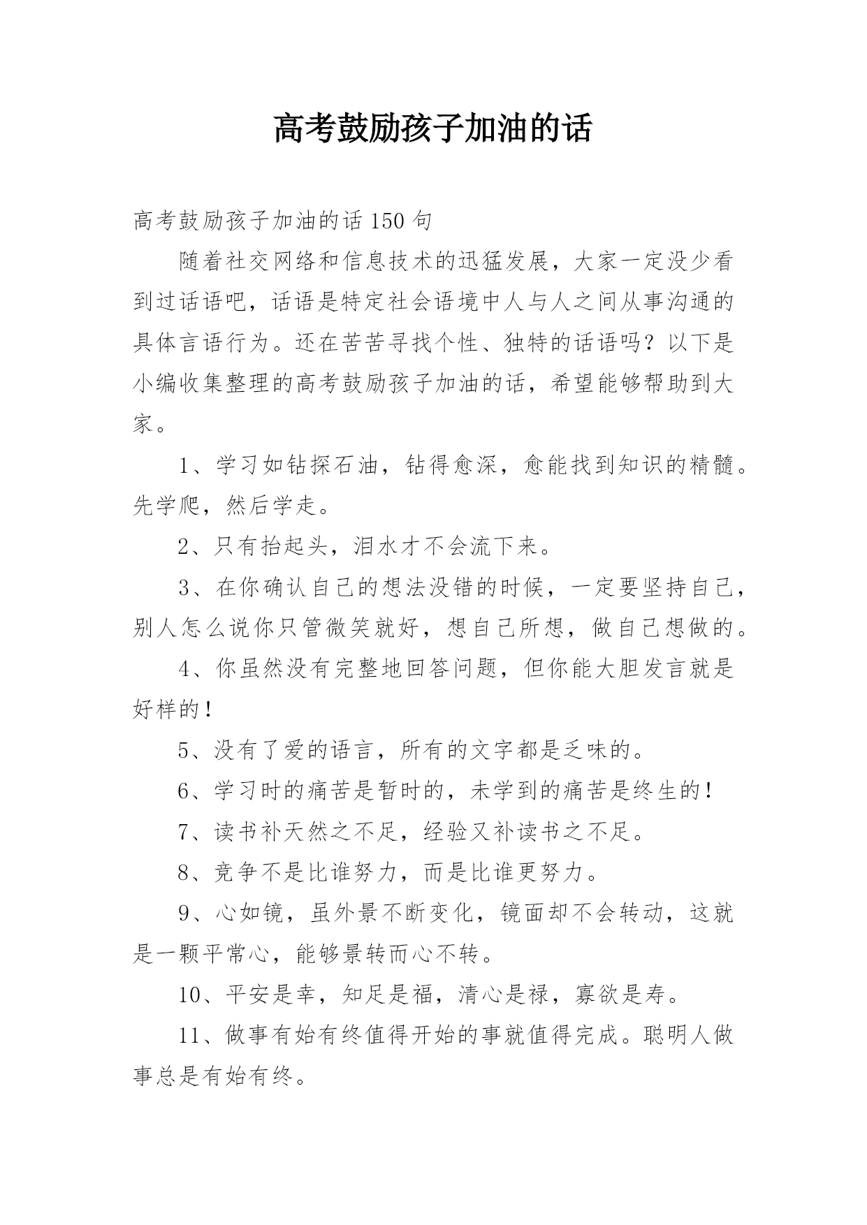 高考鼓励孩子加油的话高考鼓励孩子加油的话150句随着社交网络和信息技术的迅猛发展,大家一定没少看到过话语吧,话语是特定社会语境中人与人之间从事沟通的具体言语行为。还在苦苦寻找个性、独特的话语吗?以下是小编收集整理的高考鼓励孩子加油的话,希望能够帮助到大家。1、学习如钻探石油,钻得愈深,愈能找到知识的精髓。先学爬,然后学走。2、只有抬起头,泪水才不会流下来。3、在你确认自己的想法没错的时候,一定要坚持自己,别人怎么说你只管微笑就好,想自己所想,做自己想做的。4、你虽然没有完整地回答问题,但你能大胆发言就是好
