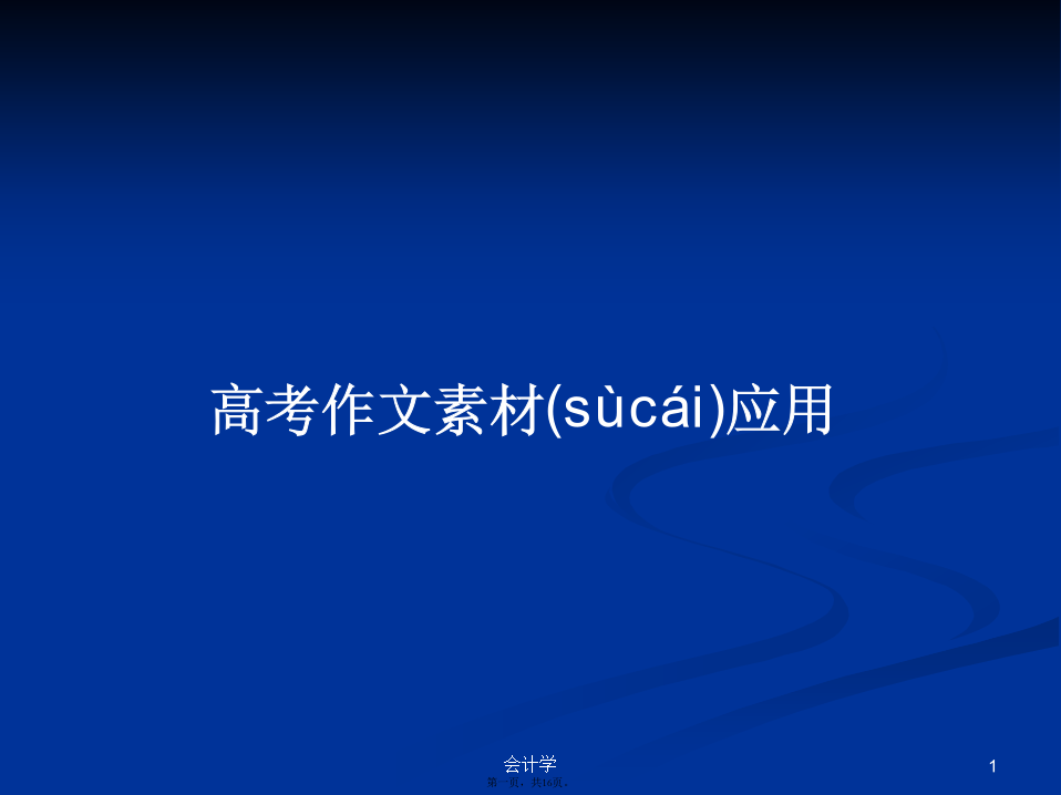 会计学1.高考作文素材(sùcái)应用技法之一材多用例如《烛之武退秦师》一文,就可以(kěyǐ)多角度切入:沙场点兵:现在的金融危机,发端于美国(měiɡuó)的次贷危机正在一步步演化和扩大为一场全球金融危机,没有一个国家可以不受影响。2.高考作文素材应用(yìngyòng)技法之旧例翻新一、李白是黄沙漫天,北风吹雁中骑驴高歌的歌者么?是以霓为线,以虹为钩的海上钓鳌客么?是遍访青山绿水、且歌且行的游者么?在那个烟花三月的时代,人们对你的期望是歌功颂德,取悦(qǔyuè)帝王换取高官厚禄;而你,偏偏要独上