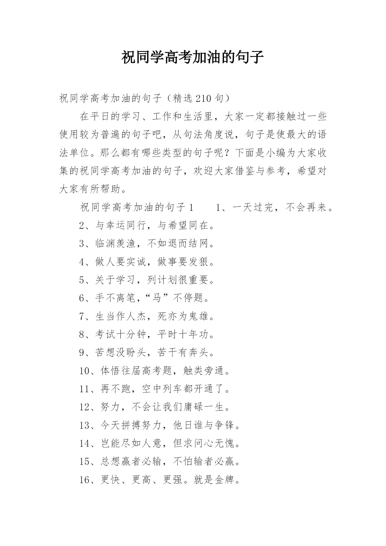 祝同学高考加油的句子祝同学高考加油的句子(精选210句)在平日的学习、工作和生活里,大家一定都接触过一些使用较为普遍的句子吧,从句法角度说,句子是使最大的语法单位。那么都有哪些类型的句子呢?下面是小编为大家收集的祝同学高考加油的句子,欢迎大家借鉴与参考,希望对大家有所帮助。祝同学高考加油的句子11、一天过完,不会再来。2、与幸运同行,与希望同在。3、临渊羡渔,不如退而结网。4、做人要实诚,做事要发狠。5、关于学习,列计划很重要。6、手不离笔,“马”不停题。7、生当作人杰,死亦为鬼雄。8、考试十分钟,平时十