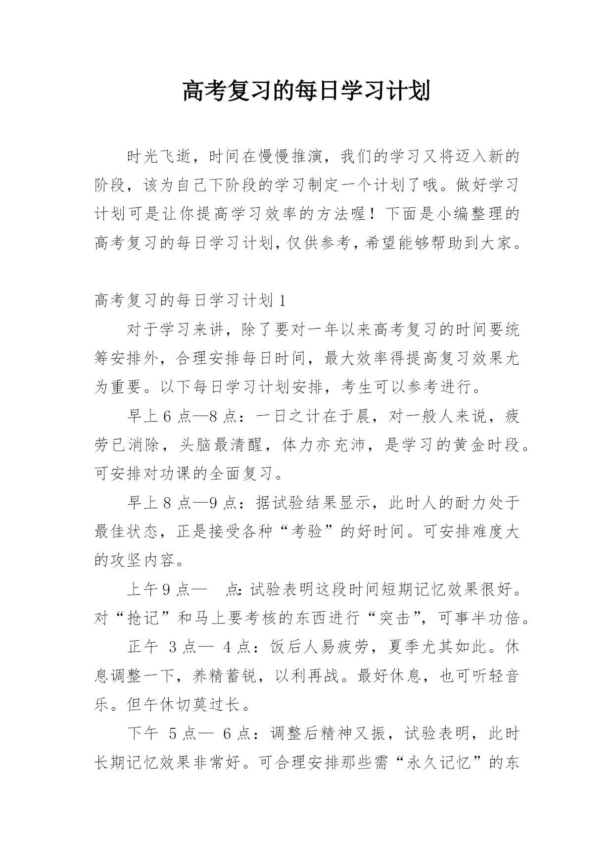 高考复习的每日学习计划时光飞逝,时间在慢慢推演,我们的学习又将迈入新的阶段,该为自己下阶段的学习制定一个计划了哦。做好学习计划可是让你提高学习效率的方法喔!下面是小编整理的高考复习的每日学习计划,仅供参考,希望能够帮助到大家。高考复习的每日学习计划1对于学习来讲,除了要对一年以来高考复习的时间要统筹安排外,合理安排每日时间,最大效率得提高复习效果尤为重要。以下每日学习计划安排,考生可以参考进行。早上6点—8点:一日之计在于晨,对一般人来说,疲劳已消除,头脑最清醒,体力亦充沛,是学习的黄金时段。可安排对功课