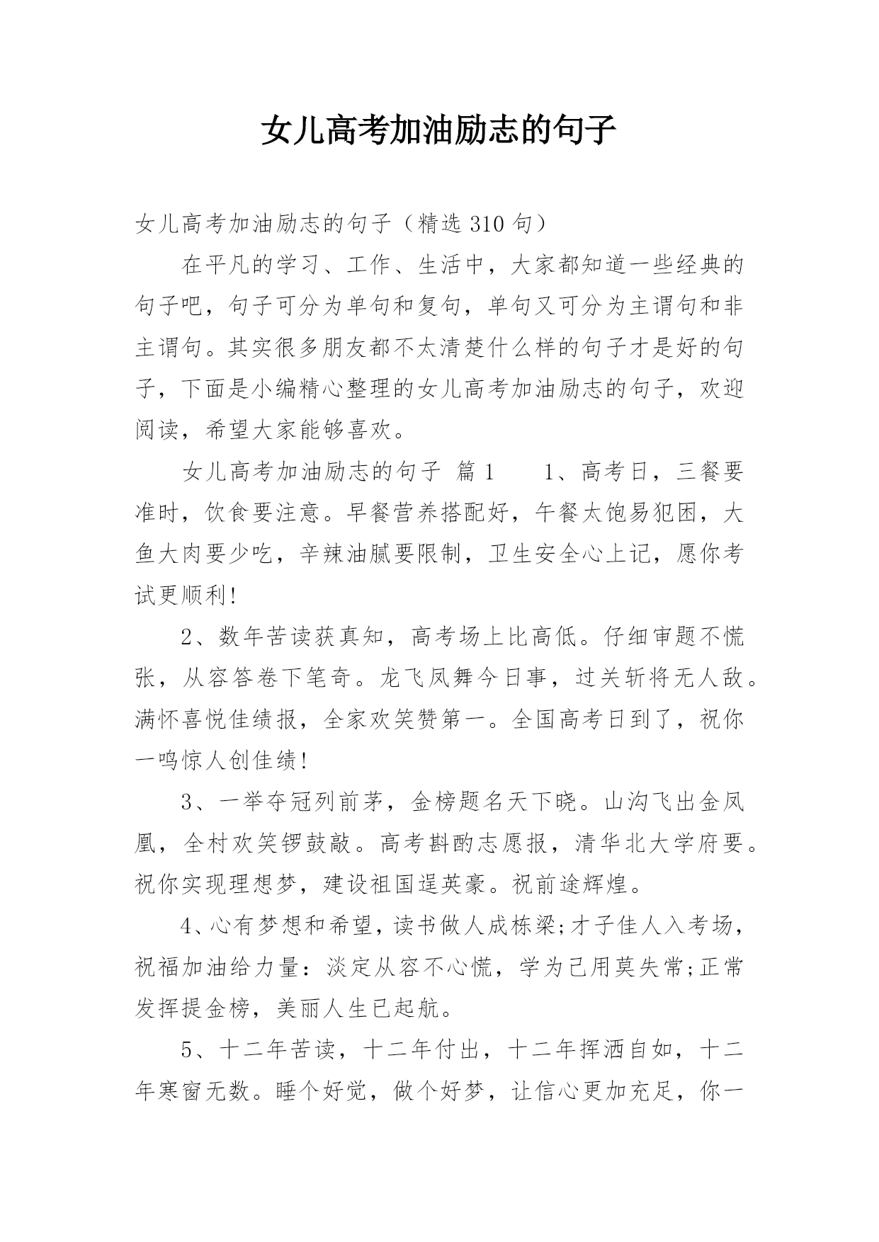 女儿高考加油励志的句子女儿高考加油励志的句子(精选310句)在平凡的学习、工作、生活中,大家都知道一些经典的句子吧,句子可分为单句和复句,单句又可分为主谓句和非主谓句。其实很多朋友都不太清楚什么样的句子才是好的句子,下面是小编精心整理的女儿高考加油励志的句子,欢迎阅读,希望大家能够喜欢。女儿高考加油励志的句子篇11、高考日,三餐要准时,饮食要注意。早餐营养搭配好,午餐太饱易犯困,大鱼大肉要少吃,辛辣油腻要限制,卫生安全心上记,愿你考试更顺利!2、数年苦读获真知,高考场上比高低。仔细审题不慌张,从容答卷下笔