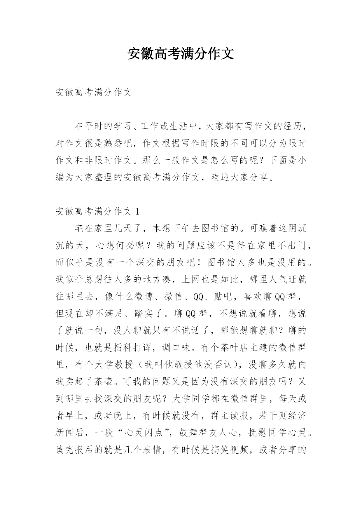 安徽高考满分作文安徽高考满分作文在平时的学习、工作或生活中,大家都有写作文的经历,对作文很是熟悉吧,作文根据写作时限的不同可以分为限时作文和非限时作文。那么一般作文是怎么写的呢?下面是小编为大家整理的安徽高考满分作文,欢迎大家分享。安徽高考满分作文1宅在家里几天了,本想下午去图书馆的。可瞧着这阴沉沉的天,心想何必呢?我的问题应该不是待在家里不出门,而似乎是没有一个深交的朋友吧!图书馆人多也是没用的。我似乎总想往人多的地方凑,上网也是如此,哪里人气旺就往哪里去,像什么微博、微信、QQ、贴吧,喜欢聊QQ群,但