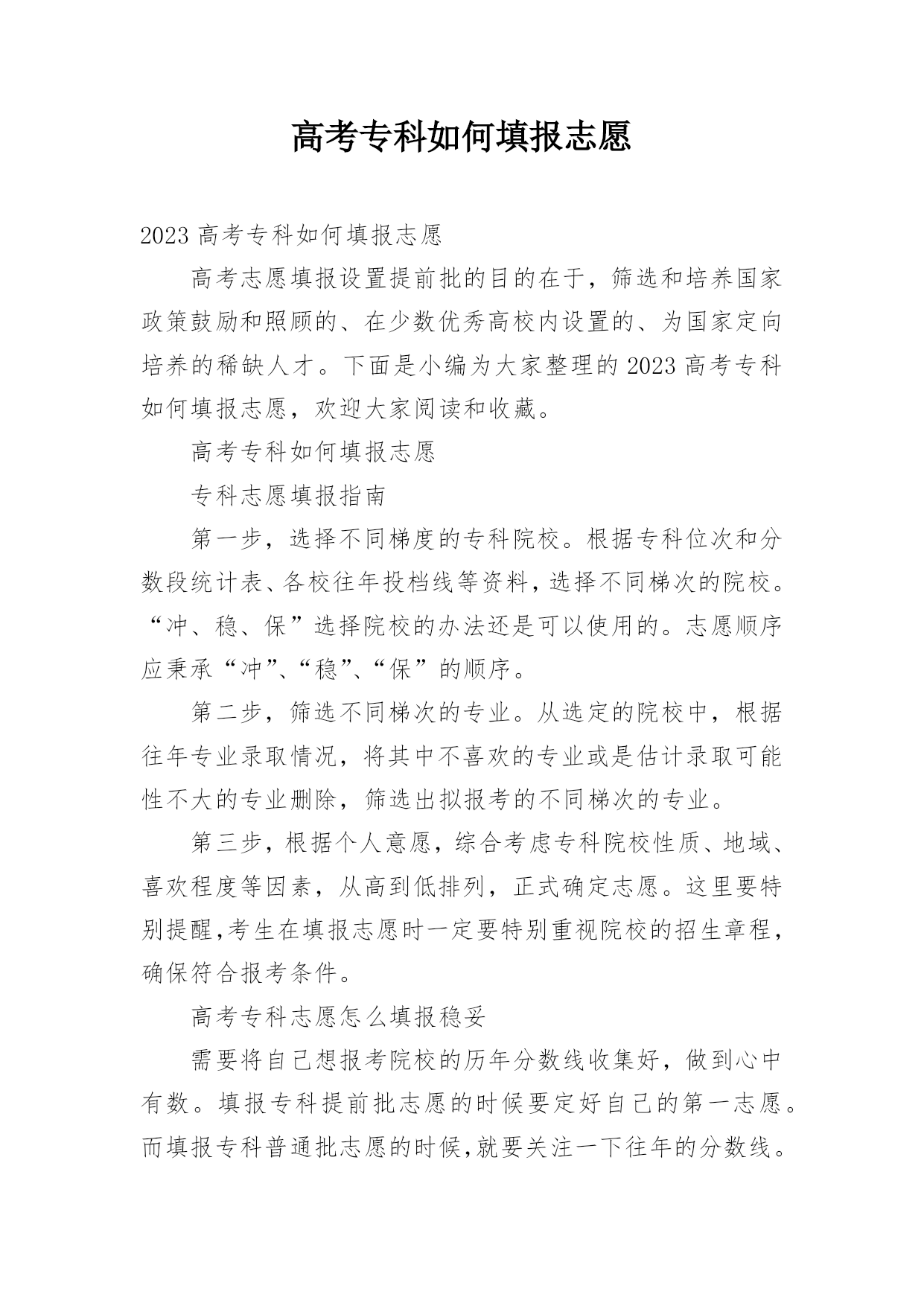 高考专科如何填报志愿2023高考专科如何填报志愿高考志愿填报设置提前批的目的在于,筛选和培养国家政策鼓励和照顾的、在少数优秀高校内设置的、为国家定向培养的稀缺人才。下面是小编为大家整理的2023高考专科如何填报志愿,欢迎大家阅读和收藏。高考专科如何填报志愿专科志愿填报指南第一步,选择不同梯度的专科院校。根据专科位次和分数段统计表、各校往年投档线等资料,选择不同梯次的院校。“冲、稳、保”选择院校的办法还是可以使用的。志愿顺序应秉承“冲”、“稳”、“保”的顺序。第二步,筛选不同梯次的专业。从选定的院校中,根据