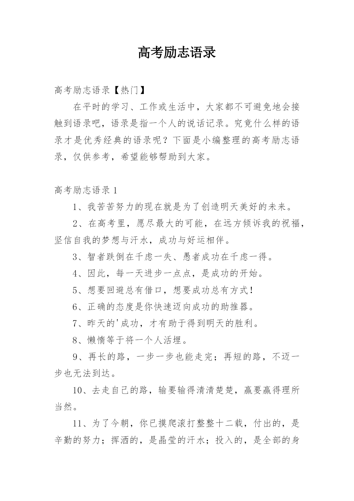 高考励志语录高考励志语录【热门】在平时的学习、工作或生活中,大家都不可避免地会接触到语录吧,语录是指一个人的说话记录。究竟什么样的语录才是优秀经典的语录呢?下面是小编整理的高考励志语录,仅供参考,希望能够帮助到大家。高考励志语录11、我苦苦努力的现在就是为了创造明天美好的未来。2、在高考里,愿尽最大的可能,在远方倾诉我的祝福,坚信自我的梦想与汗水,成功与好运相伴。3、智者跌倒在千虑一失、愚者成功在千虑一得。4、因此,每一天进步一点点,是成功的开始。5、想要回避总有借口,想要成功总有方式!6、正确的态度是你