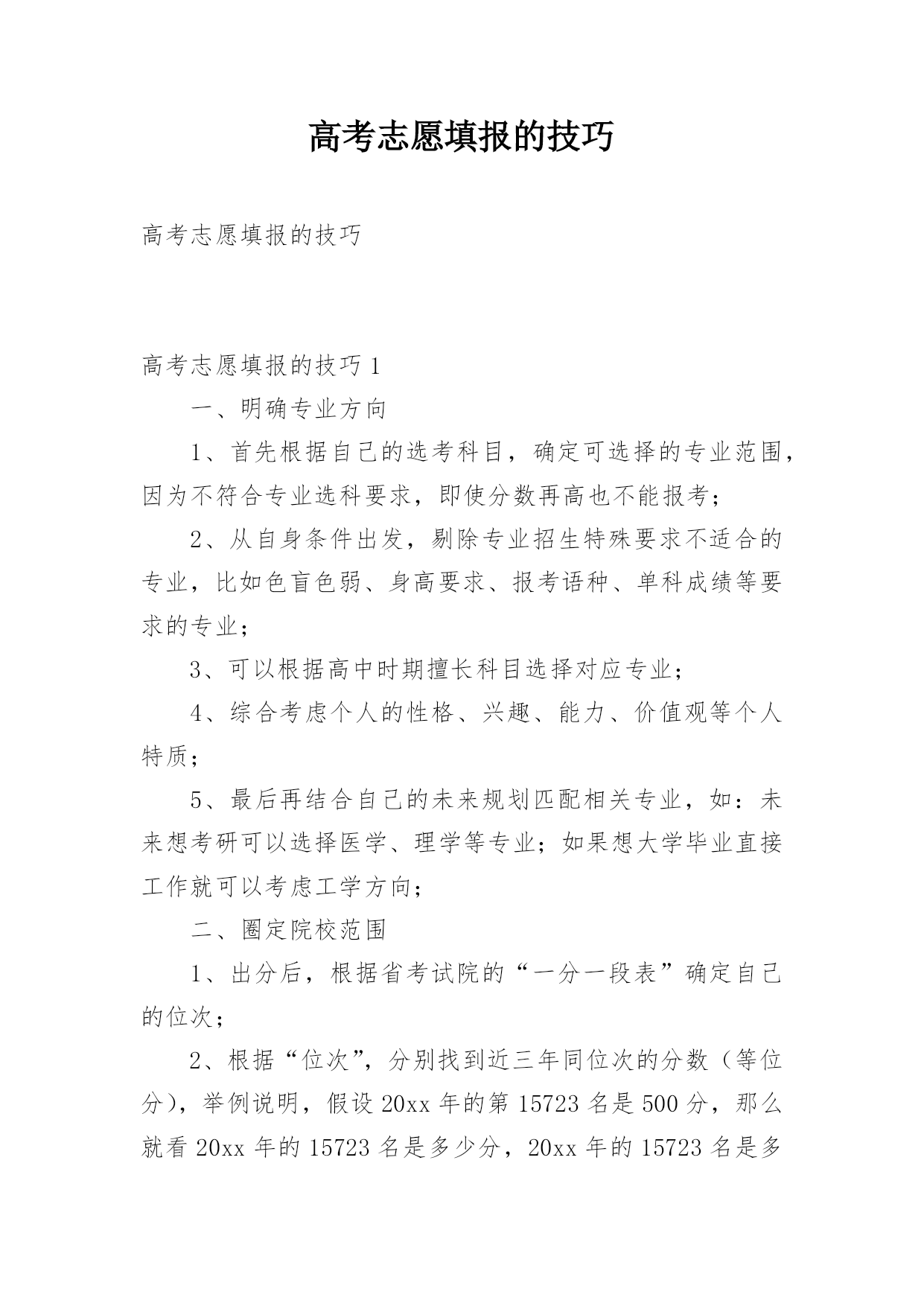 高考志愿填报的技巧高考志愿填报的技巧高考志愿填报的技巧1一、明确专业方向1、首先根据自己的选考科目,确定可选择的专业范围,因为不符合专业选科要求,即使分数再高也不能报考;2、从自身条件出发,剔除专业招生特殊要求不适合的专业,比如色盲色弱、身高要求、报考语种、单科成绩等要求的专业;3、可以根据高中时期擅长科目选择对应专业;4、综合考虑个人的性格、兴趣、能力、价值观等个人特质;5、最后再结合自己的未来规划匹配相关专业,如:未来想考研可以选择医学、理学等专业;如果想大学毕业直接工作就可以考虑工学方向;二、圈定院