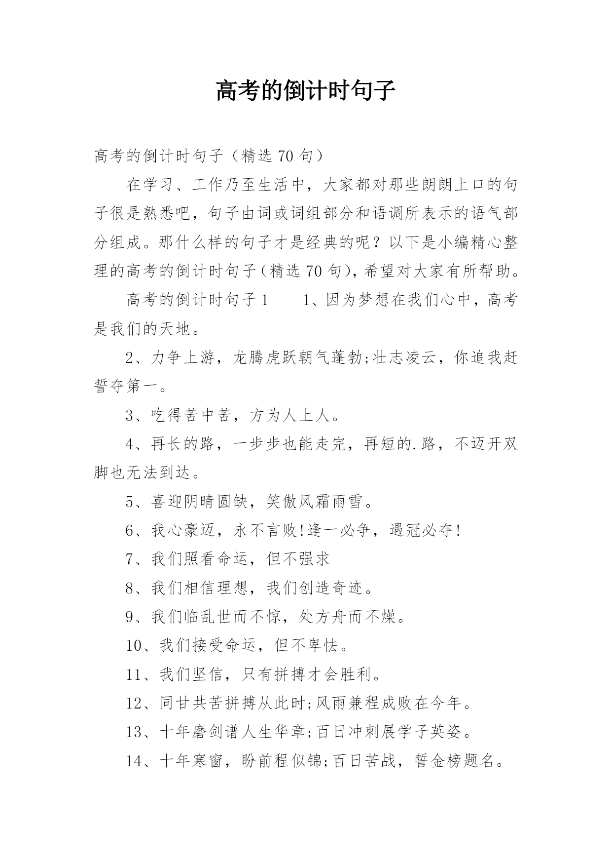 高考的倒计时句子高考的倒计时句子(精选70句)在学习、工作乃至生活中,大家都对那些朗朗上口的句子很是熟悉吧,句子由词或词组部分和语调所表示的语气部分组成。那什么样的句子才是经典的呢?以下是小编精心整理的高考的倒计时句子(精选70句),希望对大家有所帮助。高考的倒计时句子11、因为梦想在我们心中,高考是我们的天地。2、力争上游,龙腾虎跃朝气蓬勃;壮志凌云,你追我赶誓夺第一。3、吃得苦中苦,方为人上人。4、再长的路,一步步也能走完,再短的.路,不迈开双脚也无法到达。5、喜迎阴晴圆缺,笑傲风霜雨雪。6、我心豪迈