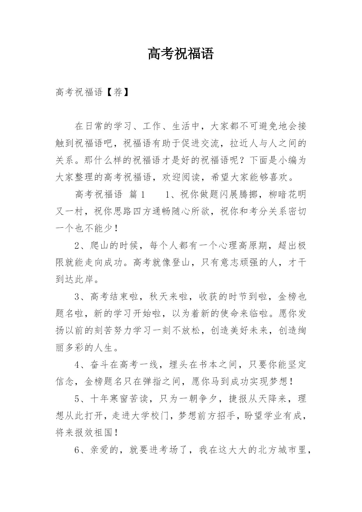 高考祝福语高考祝福语【荐】在日常的学习、工作、生活中,大家都不可避免地会接触到祝福语吧,祝福语有助于促进交流,拉近人与人之间的关系。那什么样的祝福语才是好的祝福语呢?下面是小编为大家整理的高考祝福语,欢迎阅读,希望大家能够喜欢。高考祝福语篇11、祝你做题闪展腾挪,柳暗花明又一村,祝你思路四方通畅随心所欲,祝你和考分关系密切一个也不能少!2、爬山的时候,每个人都有一个心理高原期,超出极限就能走向成功。高考就像登山,只有意志顽强的人,才干到达此岸。3、高考结束啦,秋天来啦,收获的时节到啦,金榜也题名啦,新的学