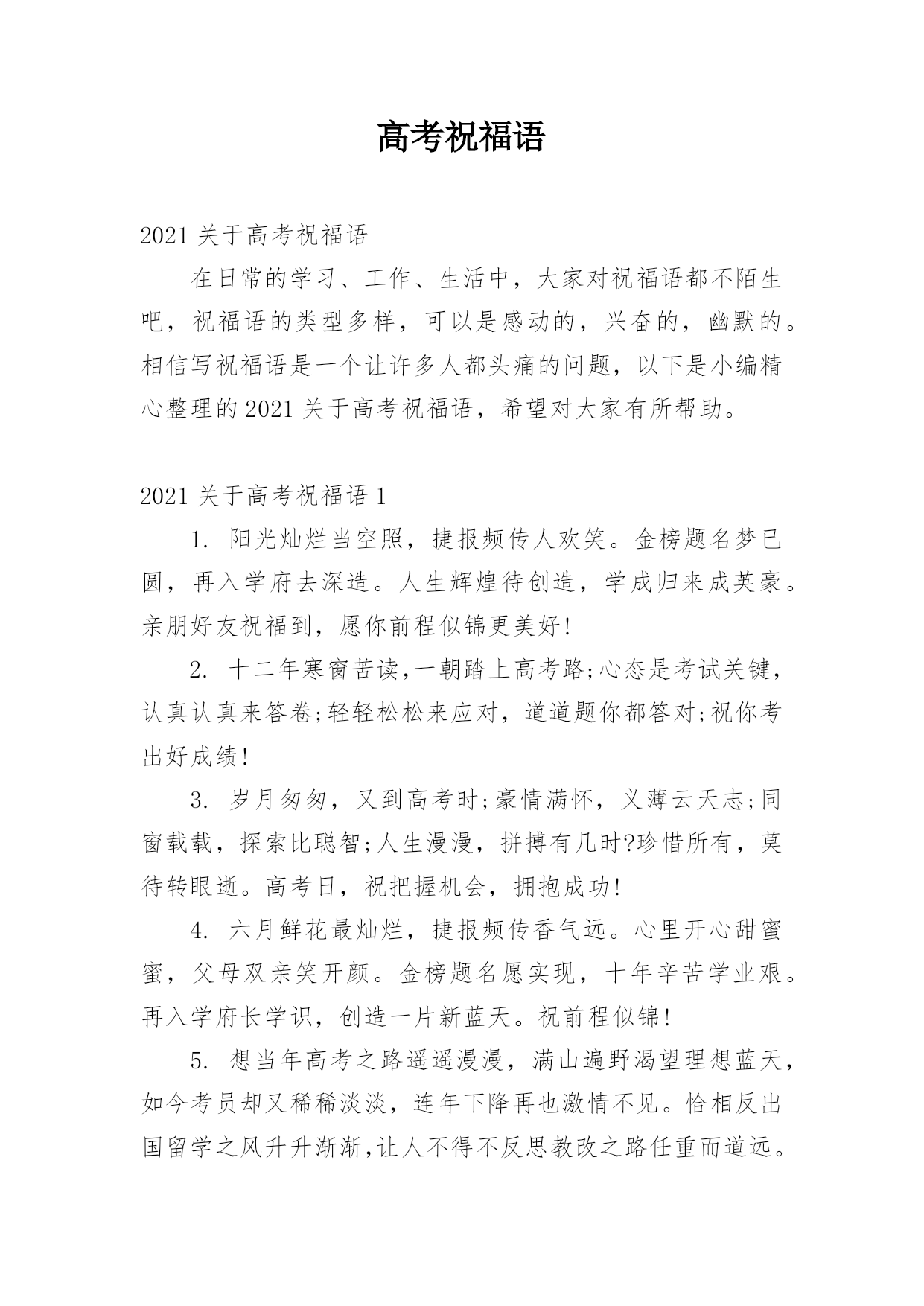 高考祝福语2021关于高考祝福语在日常的学习、工作、生活中,大家对祝福语都不陌生吧,祝福语的类型多样,可以是感动的,兴奋的,幽默的。相信写祝福语是一个让许多人都头痛的问题,以下是小编精心整理的2021关于高考祝福语,希望对大家有所帮助。2021关于高考祝福语11.阳光灿烂当空照,捷报频传人欢笑。金榜题名梦已圆,再入学府去深造。人生辉煌待创造,学成归来成英豪。亲朋好友祝福到,愿你前程似锦更美好!2.十二年寒窗苦读,一朝踏上高考路;心态是考试关键,认真认真来答卷;轻轻松松来应对,道道题你都答对;祝你考出好成绩