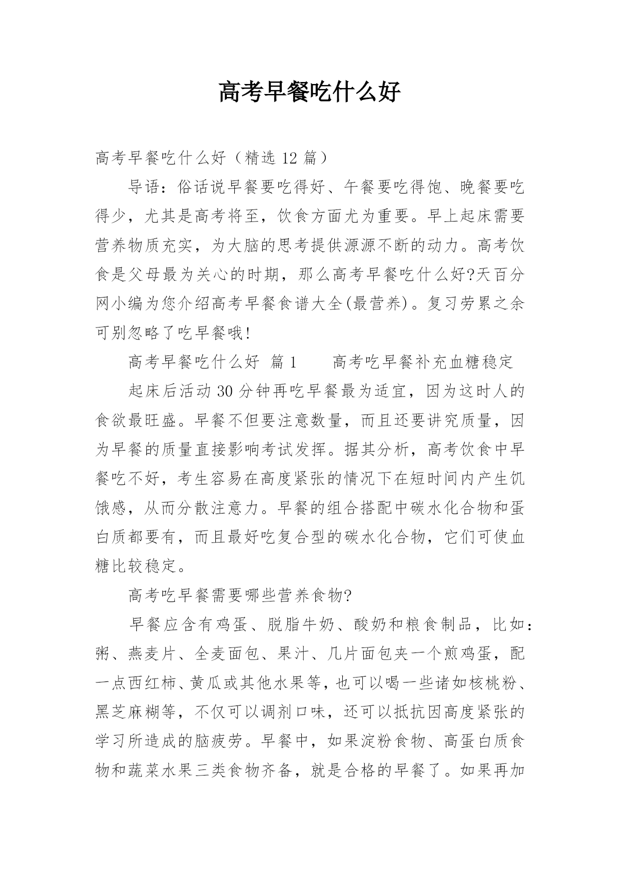 高考早餐吃什么好高考早餐吃什么好(精选12篇)导语:俗话说早餐要吃得好、午餐要吃得饱、晚餐要吃得少,尤其是高考将至,饮食方面尤为重要。早上起床需要营养物质充实,为大脑的思考提供源源不断的动力。高考饮食是父母最为关心的时期,那么高考早餐吃什么好?天百分网小编为您介绍高考早餐食谱大全(最营养)。复习劳累之余可别忽略了吃早餐哦!高考早餐吃什么好篇1高考吃早餐补充血糖稳定起床后活动30分钟再吃早餐最为适宜,因为这时人的食欲最旺盛。早餐不但要注意数量,而且还要讲究质量,因为早餐的质量直接影响考试发挥。据其分析,高考