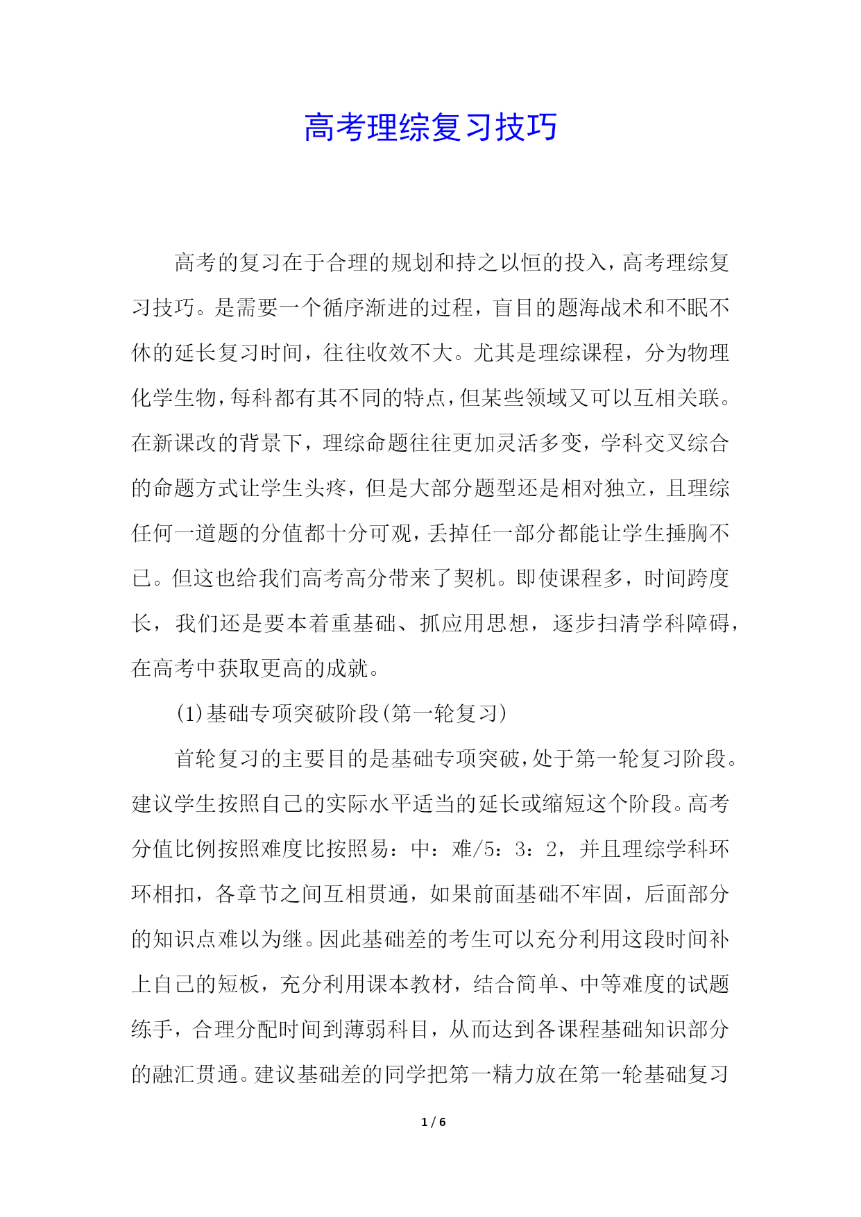 PAGE6/NUMPAGES6高考理综复习技巧高考的复习在于合理的规划和持之以恒的投入,高考理综复习技巧。是需要一个循序渐进的过程,盲目的题海战术和不眠不休的延长复习时间,往往收效不大。尤其是理综课程,分为物理化学生物,每科都有其不同的特点,但某些领域又可以互相关联。在新课改的背景下,理综命题往往更加灵活多变,学科交叉综合的命题方式让学生头疼,但是大部分题型还是相对独立,且理综任何一道题的分值都十分可观,丢掉任一部分都能让学生捶胸不已。但这也给我们高考高分带来了契机。即使课程多,时间跨度长,我