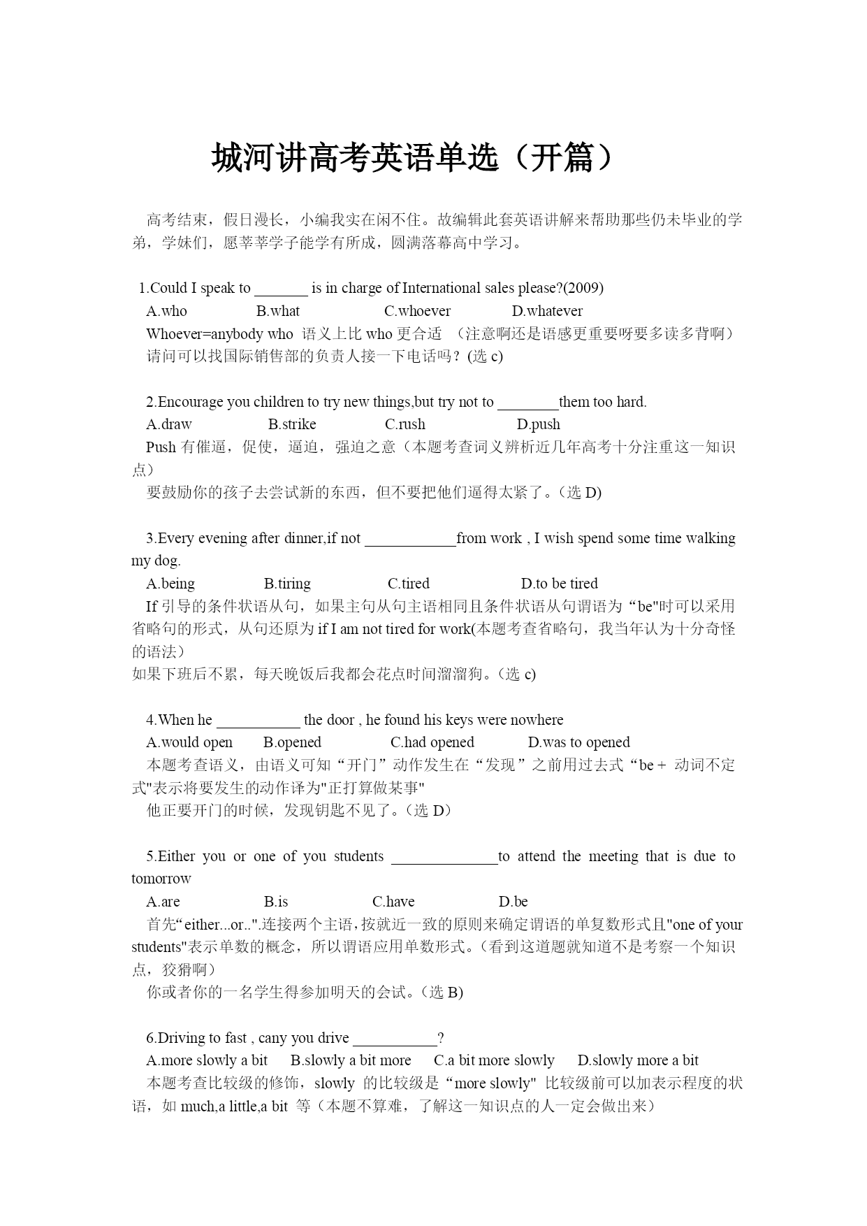 城河讲高考英语单选(开篇)高考结束,假日漫长,小编我实在闲不住。故编辑此套英语讲解来帮助那些仍未毕业的学弟,学妹们,愿莘莘学子能学有所成,圆满落幕高中学习。1.CouldIspeakto_______isinchargeofInternationalsalesplease?(2009)A.whoB.whatC.whoeverD.whateverWhoever=anybodywho语义上比who更合适(注意啊还是语感更重要呀要多读多背啊)请问可以找国际销售部的负责人接一下电话吗?(选c)2.Encourag