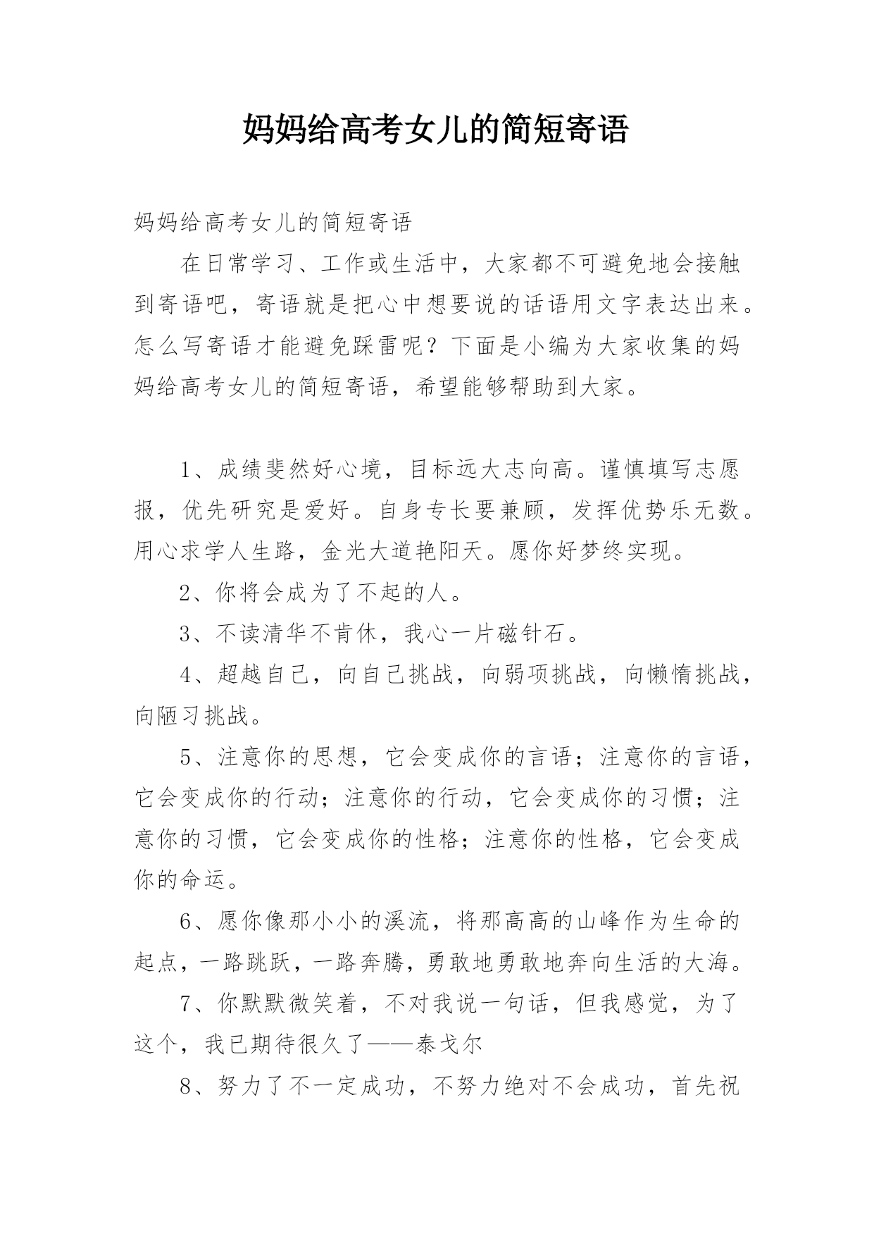 妈妈给高考女儿的简短寄语妈妈给高考女儿的简短寄语在日常学习、工作或生活中,大家都不可避免地会接触到寄语吧,寄语就是把心中想要说的话语用文字表达出来。怎么写寄语才能避免踩雷呢?下面是小编为大家收集的妈妈给高考女儿的简短寄语,希望能够帮助到大家。1、成绩斐然好心境,目标远大志向高。谨慎填写志愿报,优先研究是爱好。自身专长要兼顾,发挥优势乐无数。用心求学人生路,金光大道艳阳天。愿你好梦终实现。2、你将会成为了不起的人。3、不读清华不肯休,我心一片磁针石。4、超越自己,向自己挑战,向弱项挑战,向懒惰挑战,向陋习挑