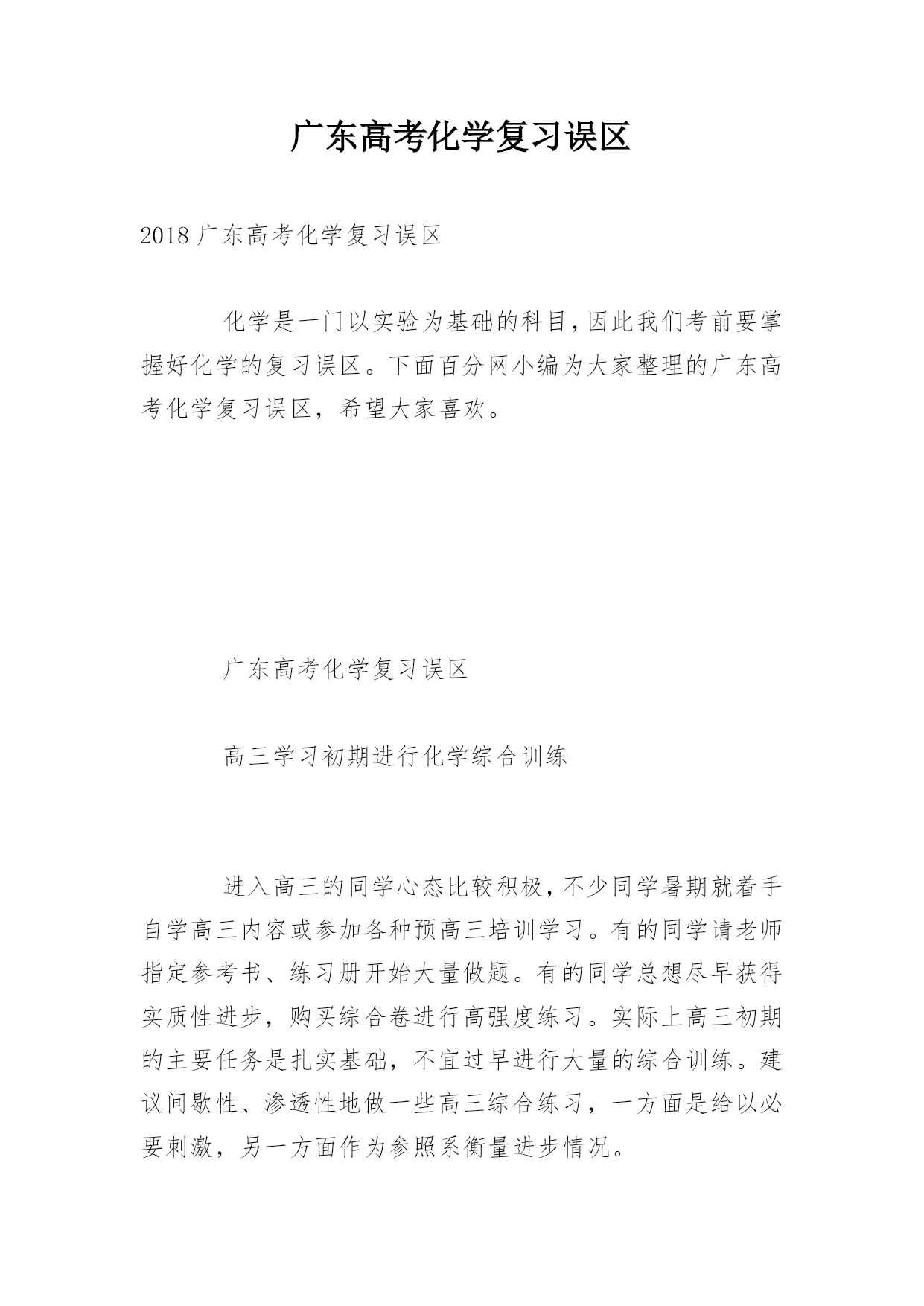 广东高考化学复习误区2018广东高考化学复习误区化学是一门以实验为基础的科目,因此我们考前要掌握好化学的复习误区。下面百分网小编为大家整理的广东高考化学复习误区,希望大家喜欢。广东高考化学复习误区高三学习初期进行化学综合训练进入高三的同学心态比较积极,不少同学暑期就着手自学高三内容或参加各种预高三培训学习。有的同学请老师指定参考书、练习册开始大量做题。有的同学总想尽早获得实质性进步,购买综合卷进行高强度练习。实际上高三初期的主要任务是扎实基础,不宜过早进行大量的综合训练。建议间歇性、渗透性地做一些高三综合