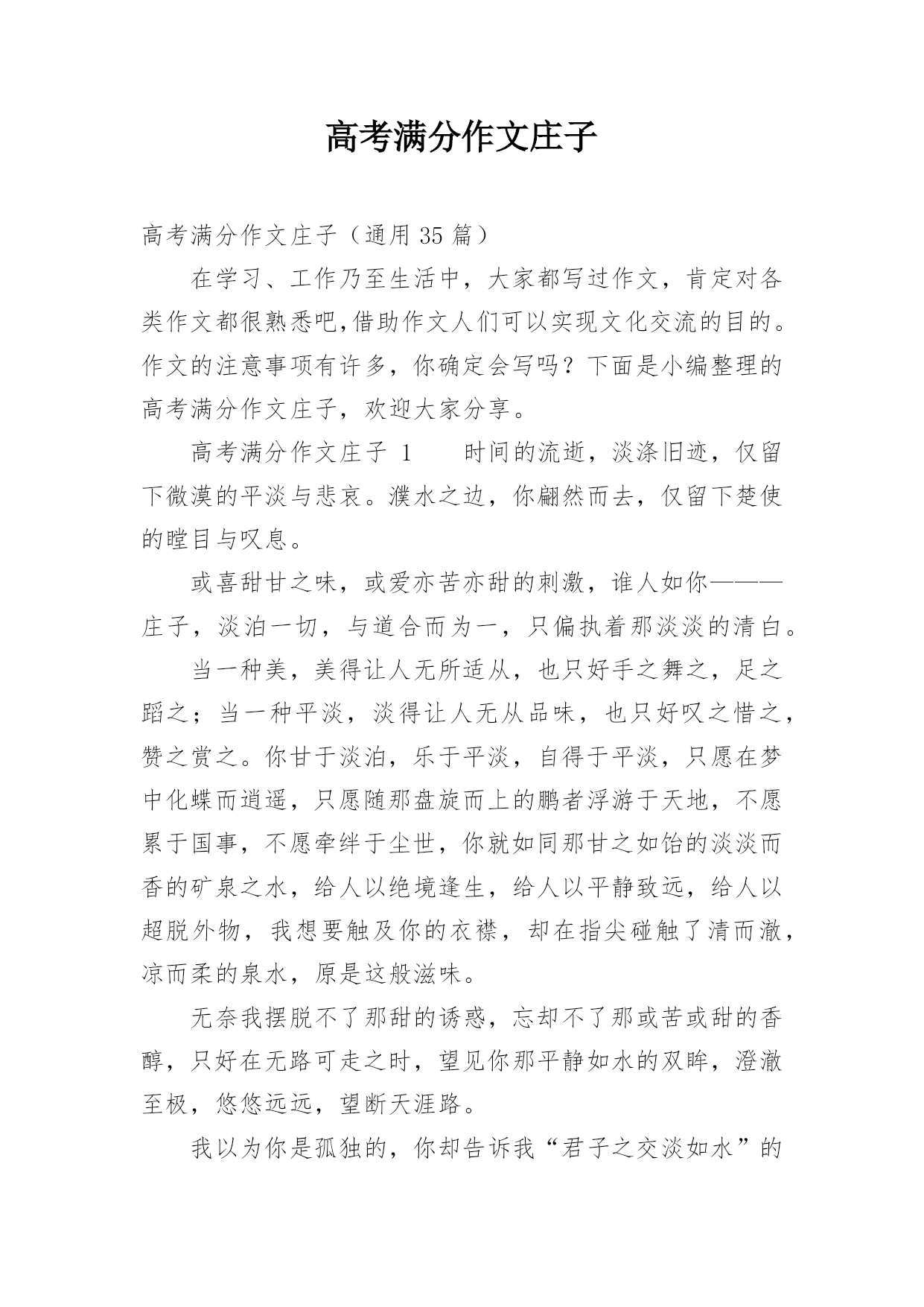高考满分作文庄子高考满分作文庄子(通用35篇)在学习、工作乃至生活中,大家都写过作文,肯定对各类作文都很熟悉吧,借助作文人们可以实现文化交流的目的。作文的注意事项有许多,你确定会写吗?下面是小编整理的高考满分作文庄子,欢迎大家分享。高考满分作文庄子1时间的流逝,淡涤旧迹,仅留下微漠的平淡与悲哀。濮水之边,你翩然而去,仅留下楚使的瞠目与叹息。或喜甜甘之味,或爱亦苦亦甜的刺激,谁人如你———庄子,淡泊一切,与道合而为一,只偏执着那淡淡的清白。当一种美,美得让人无所适从,也只好手之舞之,足之蹈之;当一种平淡,淡