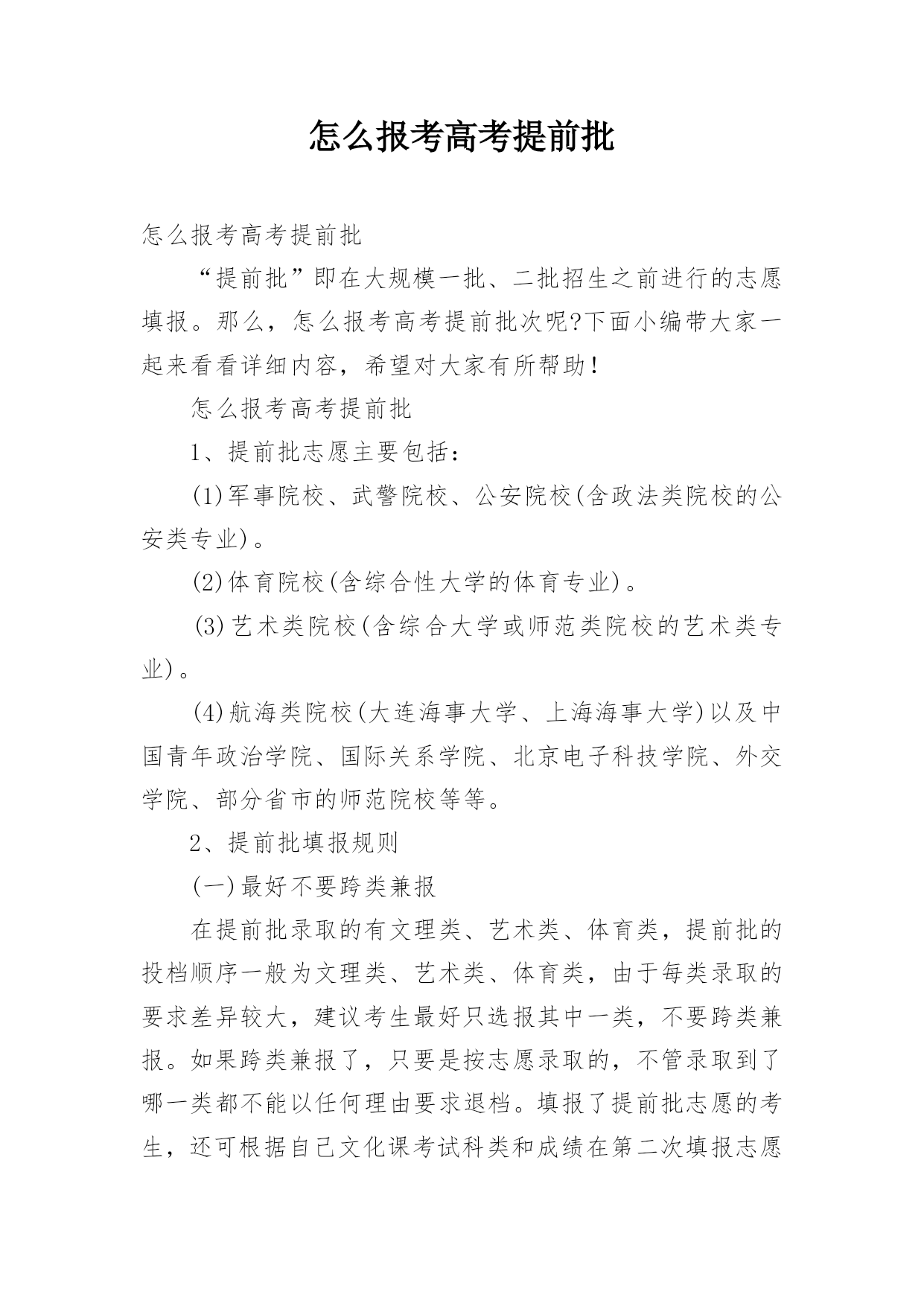 怎么报考高考提前批怎么报考高考提前批“提前批”即在大规模一批、二批招生之前进行的志愿填报。那么,怎么报考高考提前批次呢?下面小编带大家一起来看看详细内容,希望对大家有所帮助!怎么报考高考提前批1、提前批志愿主要包括:(1)军事院校、武警院校、公安院校(含政法类院校的公安类专业)。(2)体育院校(含综合性大学的体育专业)。(3)艺术类院校(含综合大学或师范类院校的艺术类专业)。(4)航海类院校(大连海事大学、上海海事大学)以及中国青年政治学院、国际关系学院、北京电子科技学院、外交学院、部分省市的师范院校等等