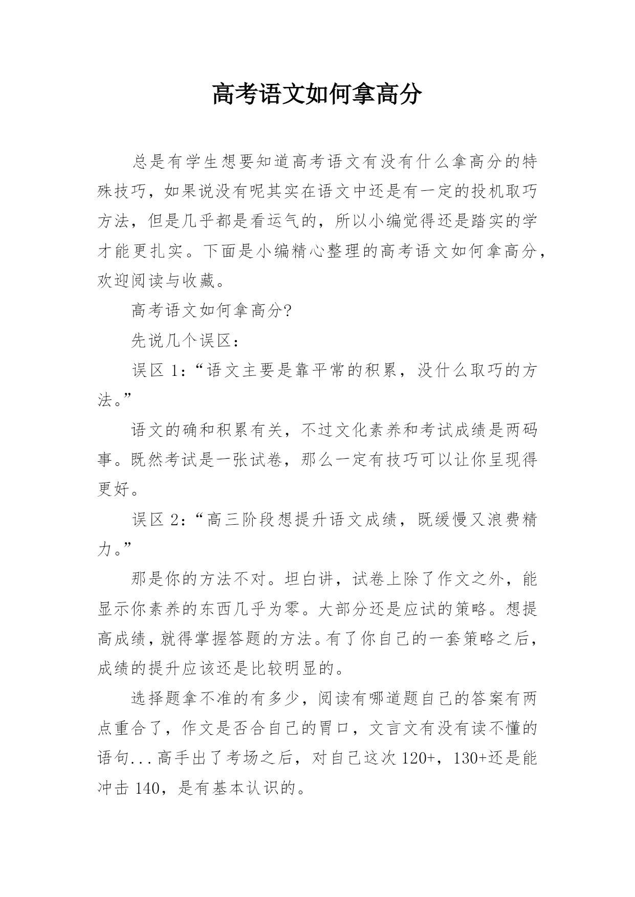 高考语文如何拿高分总是有学生想要知道高考语文有没有什么拿高分的特殊技巧,如果说没有呢其实在语文中还是有一定的投机取巧方法,但是几乎都是看运气的,所以小编觉得还是踏实的学才能更扎实。下面是小编精心整理的高考语文如何拿高分,欢迎阅读与收藏。高考语文如何拿高分?先说几个误区:误区1:“语文主要是靠平常的积累,没什么取巧的方法。”语文的确和积累有关,不过文化素养和考试成绩是两码事。既然考试是一张试卷,那么一定有技巧可以让你呈现得更好。误区2:“高三阶段想提升语文成绩,既缓慢又浪费精力。”那是你的方法不对。坦白讲,