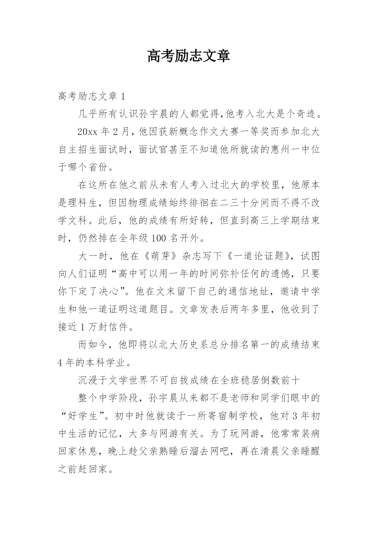 高考励志文章高考励志文章1几乎所有认识孙宇晨的人都觉得,他考入北大是个奇迹。20xx年2月,他因获新概念作文大赛一等奖而参加北大自主招生面试时,面试官甚至不知道他所就读的惠州一中位于哪个省份。在这所在他之前从未有人考入过北大的学校里,他原本是理科生,但因物理成绩始终徘徊在二三十分间而不得不改学文科。此后,他的成绩有所好转,但直到高三上学期结束时,仍然排在全年级100名开外。大一时,他在《萌芽》杂志写下《一道论证题》,试图向人们证明“高中可以用一年的时间弥补任何的遗憾,只要你下定了决心”。他在文末留下自己的