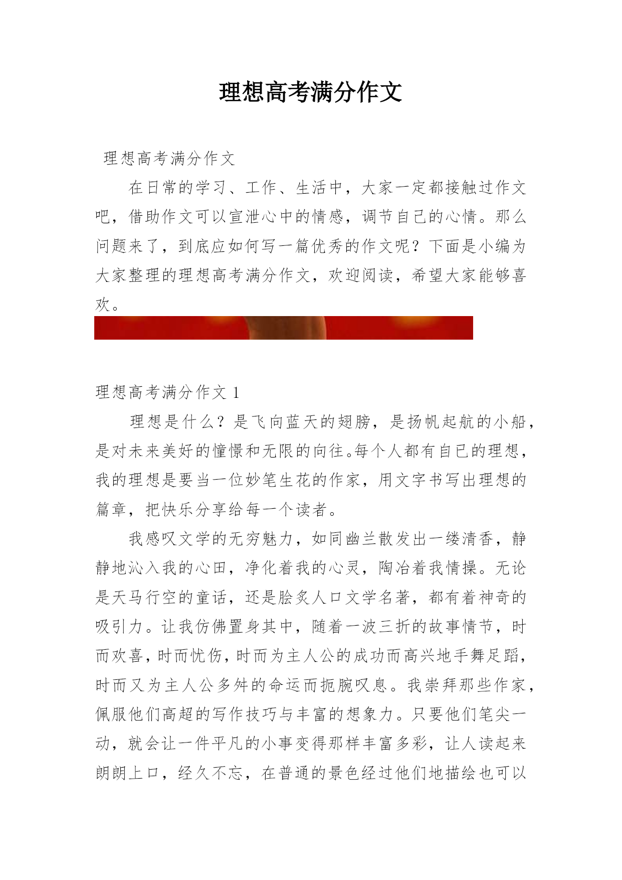 理想高考满分作文理想高考满分作文在日常的学习、工作、生活中,大家一定都接触过作文吧,借助作文可以宣泄心中的情感,调节自己的心情。那么问题来了,到底应如何写一篇优秀的作文呢?下面是小编为大家整理的理想高考满分作文,欢迎阅读,希望大家能够喜欢。理想高考满分作文1理想是什么?是飞向蓝天的翅膀,是扬帆起航的小船,是对未来美好的憧憬和无限的向往。每个人都有自已的理想,我的理想是要当一位妙笔生花的作家,用文字书写出理想的篇章,把快乐分享给每一个读者。我感叹文学的无穷魅力,如同幽兰散发出一缕清香,静静地沁入我的心田,净