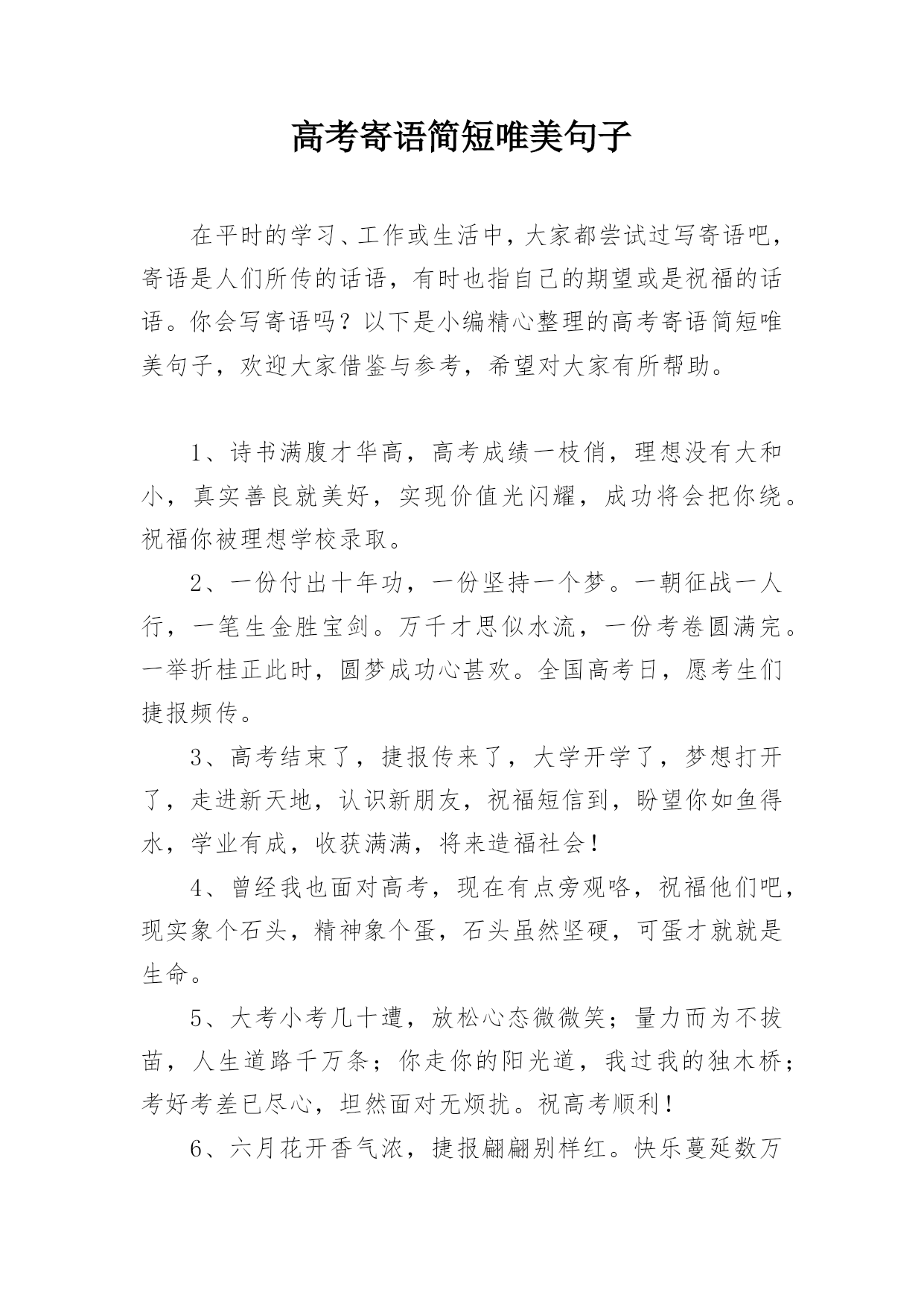 高考寄语简短唯美句子在平时的学习、工作或生活中,大家都尝试过写寄语吧,寄语是人们所传的话语,有时也指自己的期望或是祝福的话语。你会写寄语吗?以下是小编精心整理的高考寄语简短唯美句子,欢迎大家借鉴与参考,希望对大家有所帮助。1、诗书满腹才华高,高考成绩一枝俏,理想没有大和小,真实善良就美好,实现价值光闪耀,成功将会把你绕。祝福你被理想学校录取。2、一份付出十年功,一份坚持一个梦。一朝征战一人行,一笔生金胜宝剑。万千才思似水流,一份考卷圆满完。一举折桂正此时,圆梦成功心甚欢。全国高考日,愿考生们捷报频传。3、