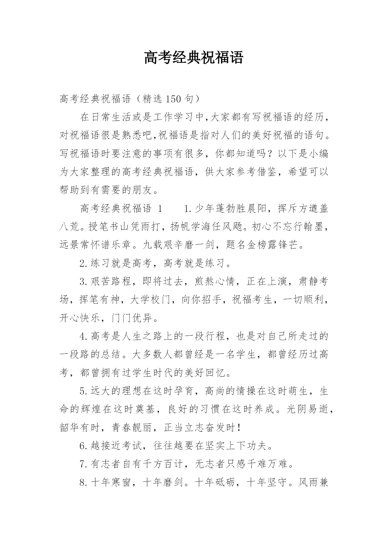 高考经典祝福语高考经典祝福语(精选150句)在日常生活或是工作学习中,大家都有写祝福语的经历,对祝福语很是熟悉吧,祝福语是指对人们的美好祝福的语句。写祝福语时要注意的事项有很多,你都知道吗?以下是小编为大家整理的高考经典祝福语,供大家参考借鉴,希望可以帮助到有需要的朋友。高考经典祝福语11.少年蓬勃胜晨阳,挥斥方遒盖八荒。授笔书山凭雨打,扬帆学海任风飏。初心不忘行翰墨,远景常怀谱乐章。九载艰辛磨一剑,题名金榜露锋芒。2.练习就是高考,高考就是练习。3.艰苦路程,即将过去,煎熬心情,正在上演,肃静考场,挥笔