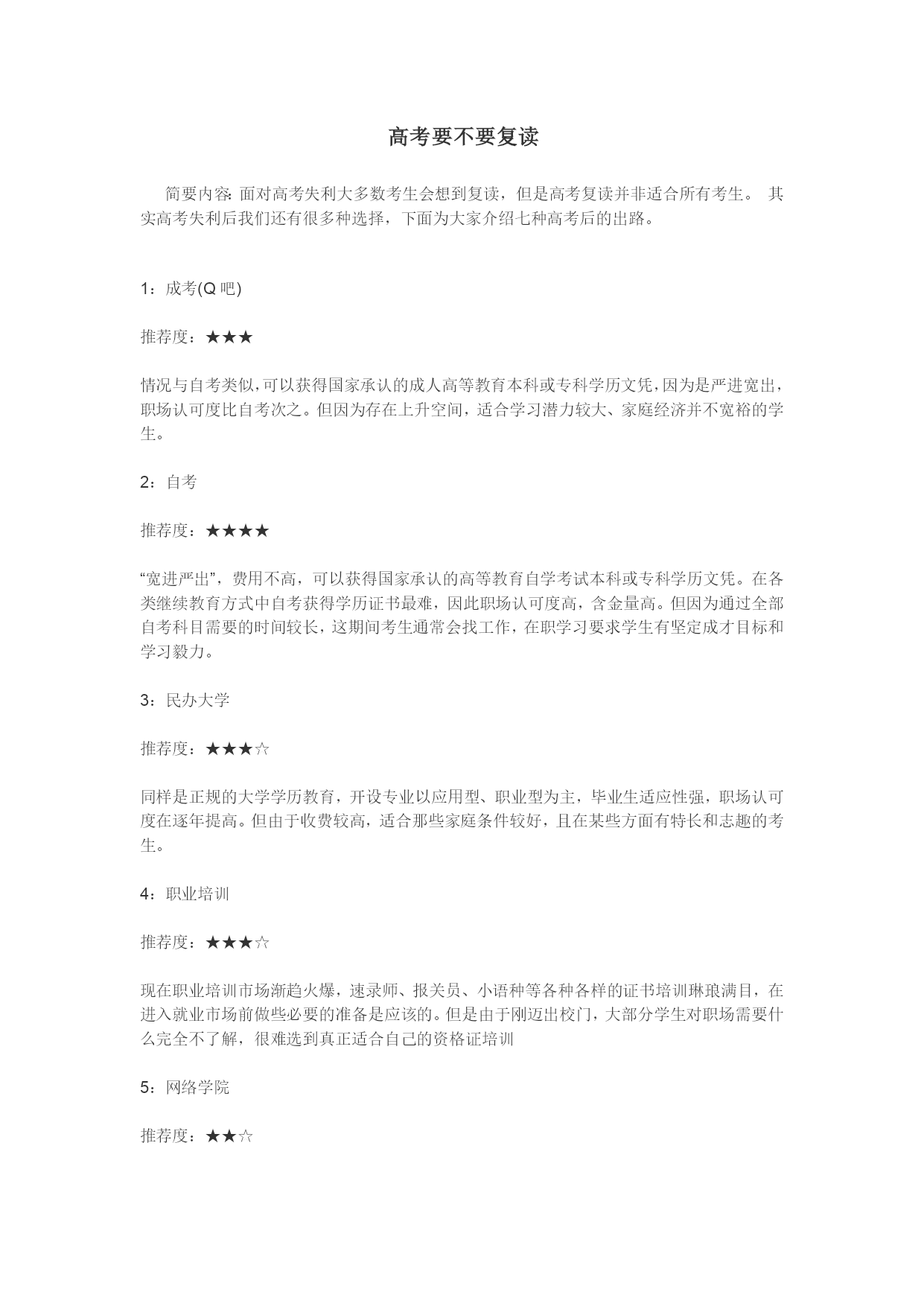 高考要不要复读简要内容:面对高考失利大多数考生会想到复读,但是高考复读并非适合所有考生。其实高考失利后我们还有很多种选择,下面为大家介绍七种高考后的出路。1:成考(Q吧)推荐度:★★★情况与自考类似,可以获得国家承认的成人高等教育本科或专科学历文凭,因为是严进宽出,职场认可度比自考次之。但因为存在上升空间,适合学习潜力较大、家庭经济并不宽裕的学生。2:自考推荐度:★★★★“宽进严出”,费用不高,可以获得国家承认的高等教育自学考试本科或专科学历文凭。在各类继续教育方式中自考获得学历证书最难,因此职场认可度高