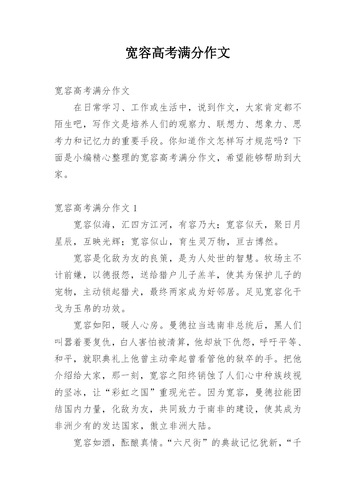 宽容高考满分作文宽容高考满分作文在日常学习、工作或生活中,说到作文,大家肯定都不陌生吧,写作文是培养人们的观察力、联想力、想象力、思考力和记忆力的重要手段。你知道作文怎样写才规范吗?下面是小编精心整理的宽容高考满分作文,希望能够帮助到大家。宽容高考满分作文1宽容似海,汇四方江河,有容乃大;宽容似天,聚日月星辰,互映光辉;宽容似山,育生灵万物,亘古博然。宽容是化敌为友的良策,是为人处世的智慧。牧场主不计前嫌,以德报怨,送给猎户儿子羔羊,使其为保护儿子的宠物,主动锁起猎犬,最终两家成为好邻居。足见宽容化干戈为
