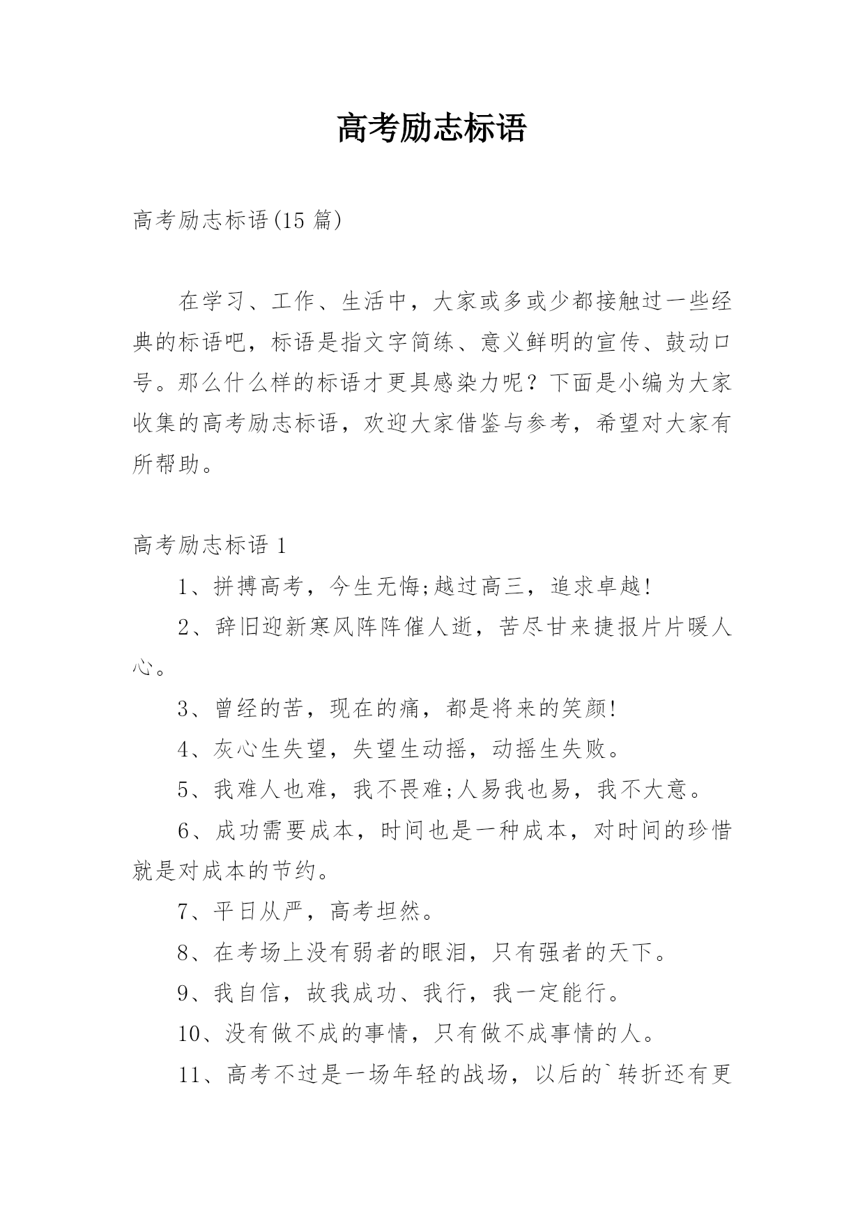 高考励志标语高考励志标语(15篇)在学习、工作、生活中,大家或多或少都接触过一些经典的标语吧,标语是指文字简练、意义鲜明的宣传、鼓动口号。那么什么样的标语才更具感染力呢?下面是小编为大家收集的高考励志标语,欢迎大家借鉴与参考,希望对大家有所帮助。高考励志标语11、拼搏高考,今生无悔;越过高三,追求卓越!2、辞旧迎新寒风阵阵催人逝,苦尽甘来捷报片片暖人心。3、曾经的苦,现在的痛,都是将来的笑颜!4、灰心生失望,失望生动摇,动摇生失败。5、我难人也难,我不畏难;人易我也易,我不大意。6、成功需要成本,时间也是