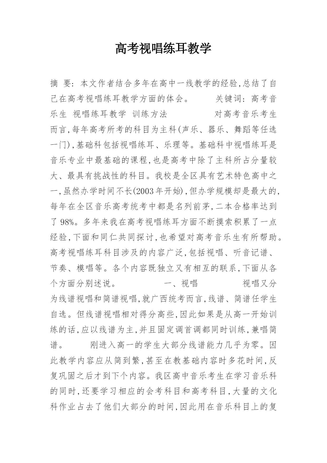 高考视唱练耳教学摘要:本文作者结合多年在高中一线教学的经验,总结了自己在高考视唱练耳教学方面的体会。关键词:高考音乐生视唱练耳教学训练方法对高考音乐考生而言,每年高考所考的科目为主科(声乐、器乐、舞蹈等任选一门),基础科包括视唱练耳、乐理等。基础科中视唱练耳是音乐专业中最基础的课程,也是高考中除了主科所占分量较大、最具有挑战性的科目。我校是全区具有艺术特色高中之一,虽然办学时间不长(2003年开始),但办学规模却是最大的,每年在全区音乐高考统考中都是名列前茅,二本合格率达到了98%。多年来我在高考视唱练耳