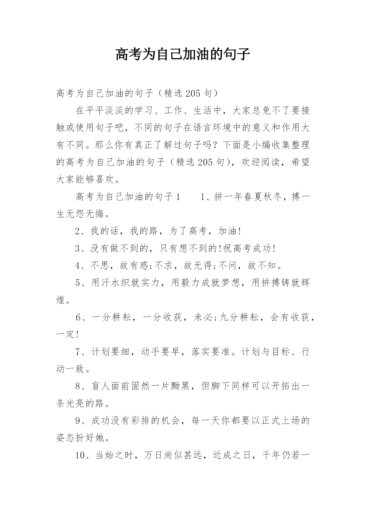 高考为自己加油的句子高考为自己加油的句子(精选205句)在平平淡淡的学习、工作、生活中,大家总免不了要接触或使用句子吧,不同的句子在语言环境中的意义和作用大有不同。那么你有真正了解过句子吗?下面是小编收集整理的高考为自己加油的句子(精选205句),欢迎阅读,希望大家能够喜欢。高考为自己加油的句子11、拼一年春夏秋冬,搏一生无怨无悔。2、我的话,我的路,为了高考,加油!3、没有做不到的,只有想不到的!祝高考成功!4、不思,故有惑;不求,故无得;不问,故不知。5、用汗水织就实力,用毅力成就梦想,用拼搏铸就辉煌