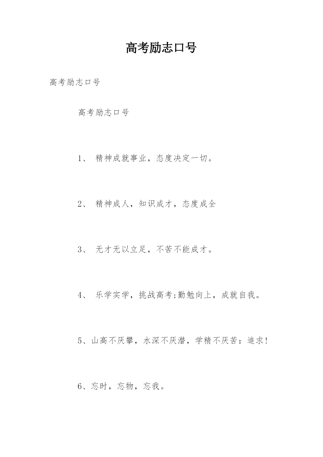 高考励志口号高考励志口号高考励志口号1、精神成就事业,态度决定一切。2、精神成人,知识成才,态度成全3、无才无以立足,不苦不能成才。4、乐学实学,挑战高考;勤勉向上,成就自我。5、山高不厌攀,水深不厌潜,学精不厌苦:追求!6、忘时,忘物,忘我。7、诚实,朴实,踏实。8、努力造就实力,态度决定高度。9、辛苦三年,幸福一生。10、我七、飞翔,路在脚下。11、不经风雨,怎见彩虹?12、我自信,我出色:我拼搏,我成功!13、拧成一股绳,搏尽一份力,狠下一条心,共圆一个梦14、努力就能成功,坚持确保胜利。15、回忆