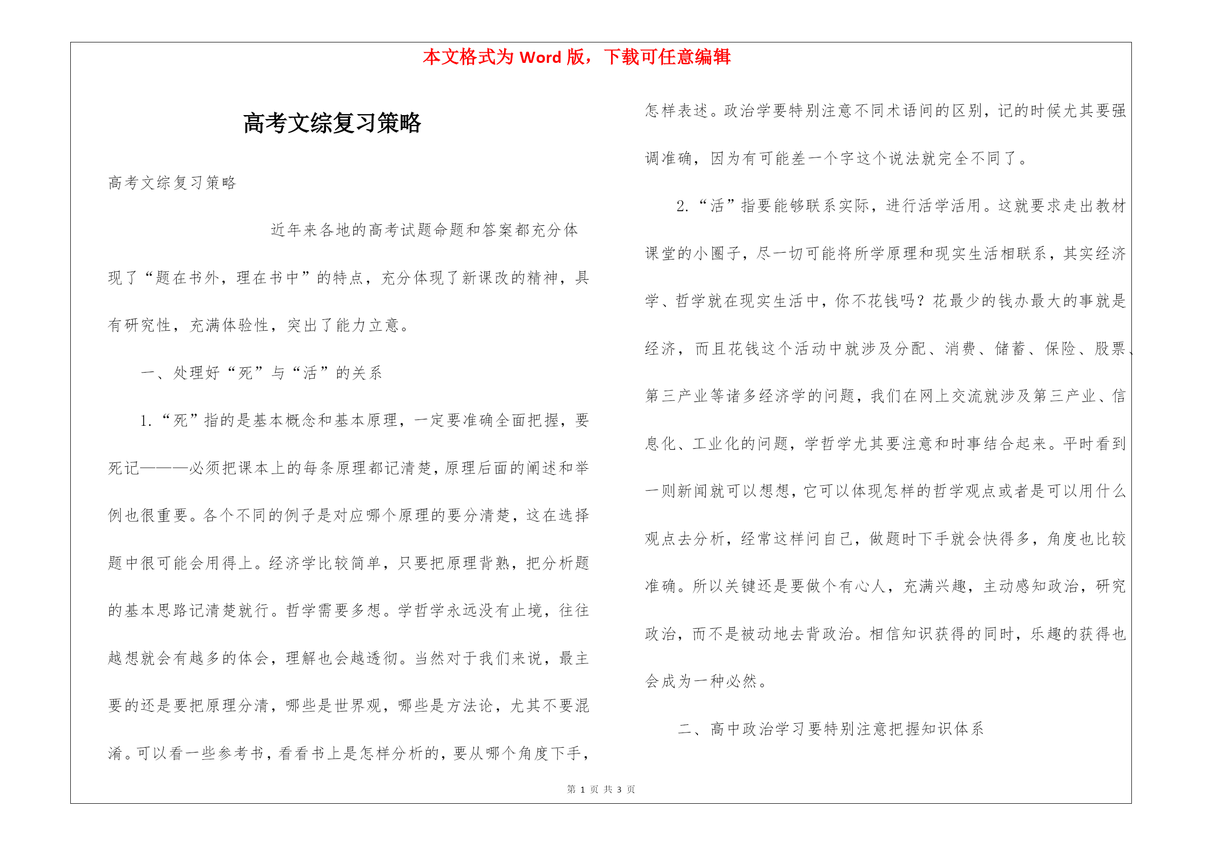 本文格式为Word版,下载可任意编辑第PAGE\*MERGEFORMAT3页共NUMPAGES\*MERGEFORMAT3页高考文综复习策略高考文综复习策略近年来各地的高考试题命题和答案都充分体现了“题在书外,理在书中”的特点,充分体现了新课改的精神,具有研究性,充满体验性,突出了能力立意。一、处理好“死”与“活”的关系1.“死”指的是基本概念和基本原理,一定要准确全面把握,要死记———必须把课本上的每条原理都记清楚,原理后面的阐述和举例也很重要。各个不同的例子是对应哪个原理的要分清楚,这在选