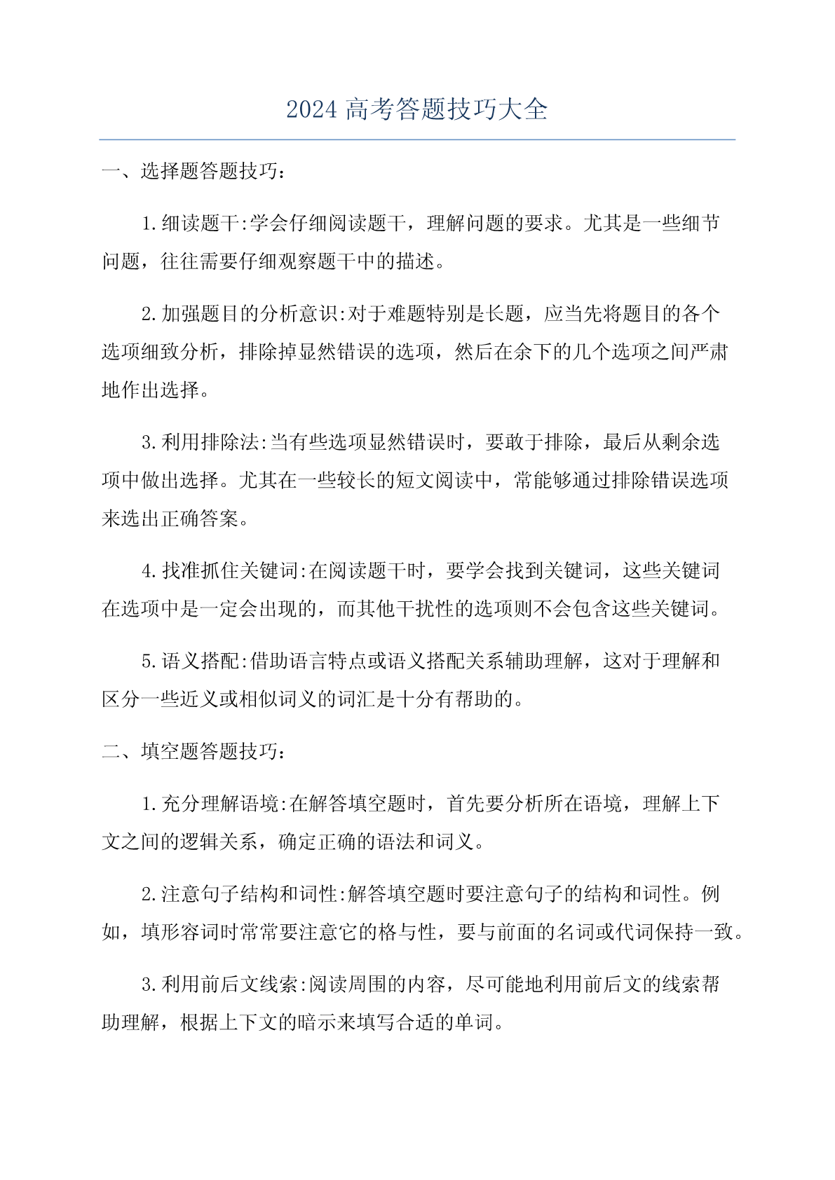 2024高考答题技巧大全一、选择题答题技巧:1.细读题干:学会仔细阅读题干,理解问题的要求。尤其是一些细节问题,往往需要仔细观察题干中的描述。2.加强题目的分析意识:对于难题特别是长题,应当先将题目的各个选项细致分析,排除掉显然错误的选项,然后在余下的几个选项之间严肃地作出选择。3.利用排除法:当有些选项显然错误时,要敢于排除,最后从剩余选项中做出选择。尤其在一些较长的短文阅读中,常能够通过排除错误选项来选出正确答案。4.找准抓住关键词:在阅读题干时,要学会找到关键词,这些关键词在选项中是一定会出现的,而
