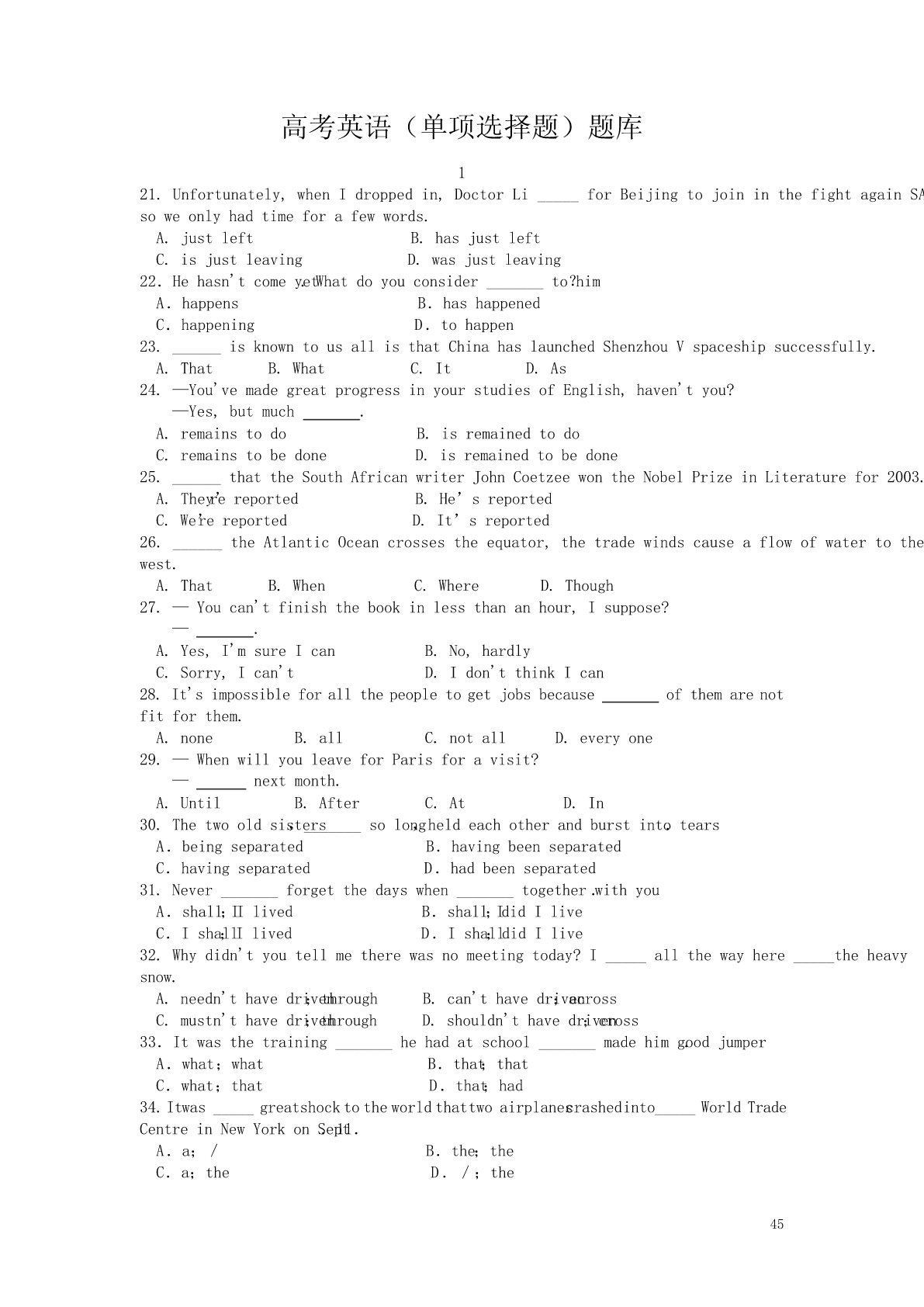 高考英语(单项选择题)题库121.Unfortunately,whenIdroppedin,DoctorLi_____forBeijingtojoininthefightagainSARS,soweonlyhadtimeforafewwords.A.justleftB.hasjustleftC.isjustleavingD.wasjustleaving22.Hehasn'tcomeyet.Whatdoyouconsider_______to?himA.happensB.hashappenedC.happe