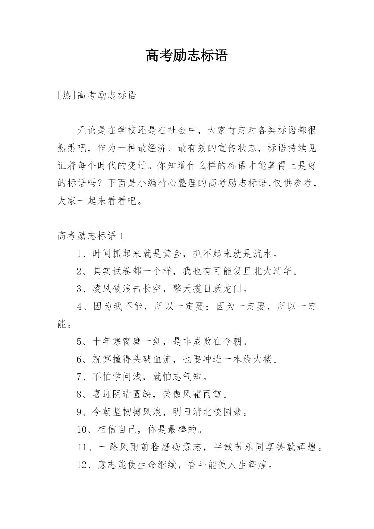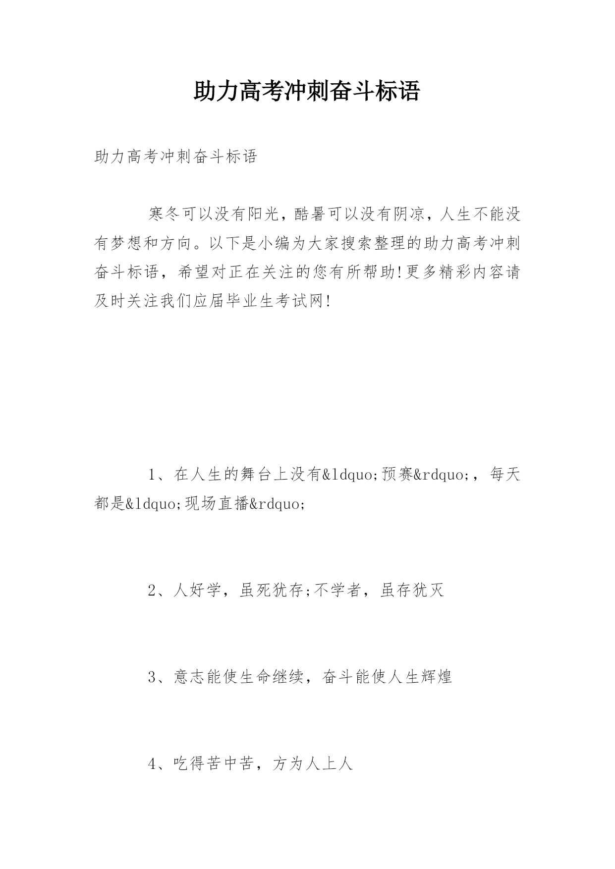 助力高考冲刺奋斗标语助力高考冲刺奋斗标语寒冬可以没有阳光,酷暑可以没有阴凉,人生不能没有梦想和方向。以下是小编为大家搜索整理的助力高考冲刺奋斗标语,希望对正在关注的您有所帮助!更多精彩内容请及时关注我们应届毕业生考试网!1、在人生的舞台上没有“预赛”,每天都是“现场直播”2、人好学,虽死犹存;不学者,虽存犹灭3、意志能使生命继续,奋斗能使人生辉煌4、吃得苦中苦,方为人上人5、苦干加巧干,本科重点有希望6、保专科,争本科7、忍耐一分期待,就可能握住十分的收获8