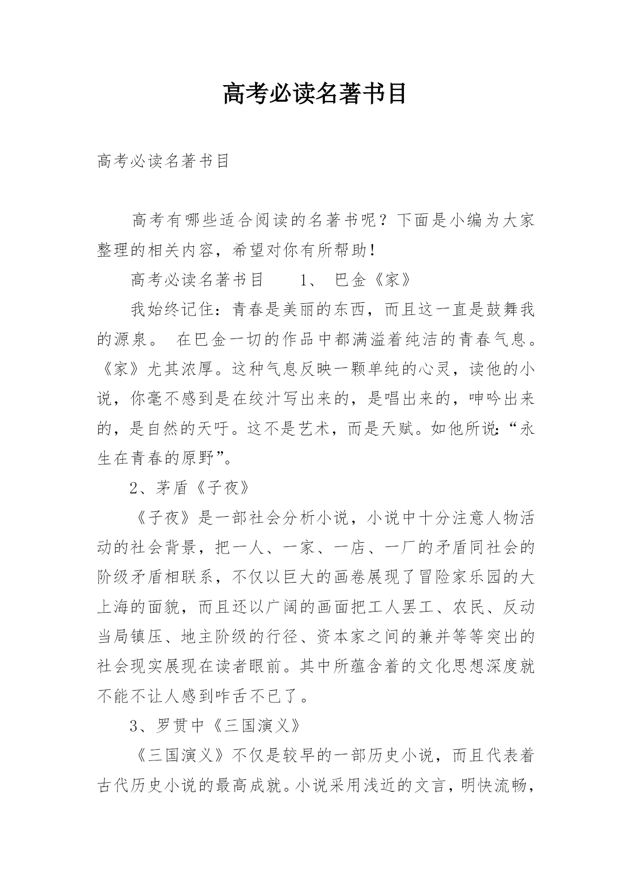 高考必读名著书目高考必读名著书目高考有哪些适合阅读的名著书呢?下面是小编为大家整理的相关内容,希望对你有所帮助!高考必读名著书目1、巴金《家》我始终记住:青春是美丽的东西,而且这一直是鼓舞我的源泉。在巴金一切的作品中都满溢着纯洁的青春气息。《家》尤其浓厚。这种气息反映一颗单纯的心灵,读他的小说,你毫不感到是在绞汁写出来的,是唱出来的,呻吟出来的,是自然的天吁。这不是艺术,而是天赋。如他所说:“永生在青春的原野”。2、茅盾《子夜》《子夜》是一部社会分析小说,小说中十分注意人物活动的社会背景,把一人、一家、一