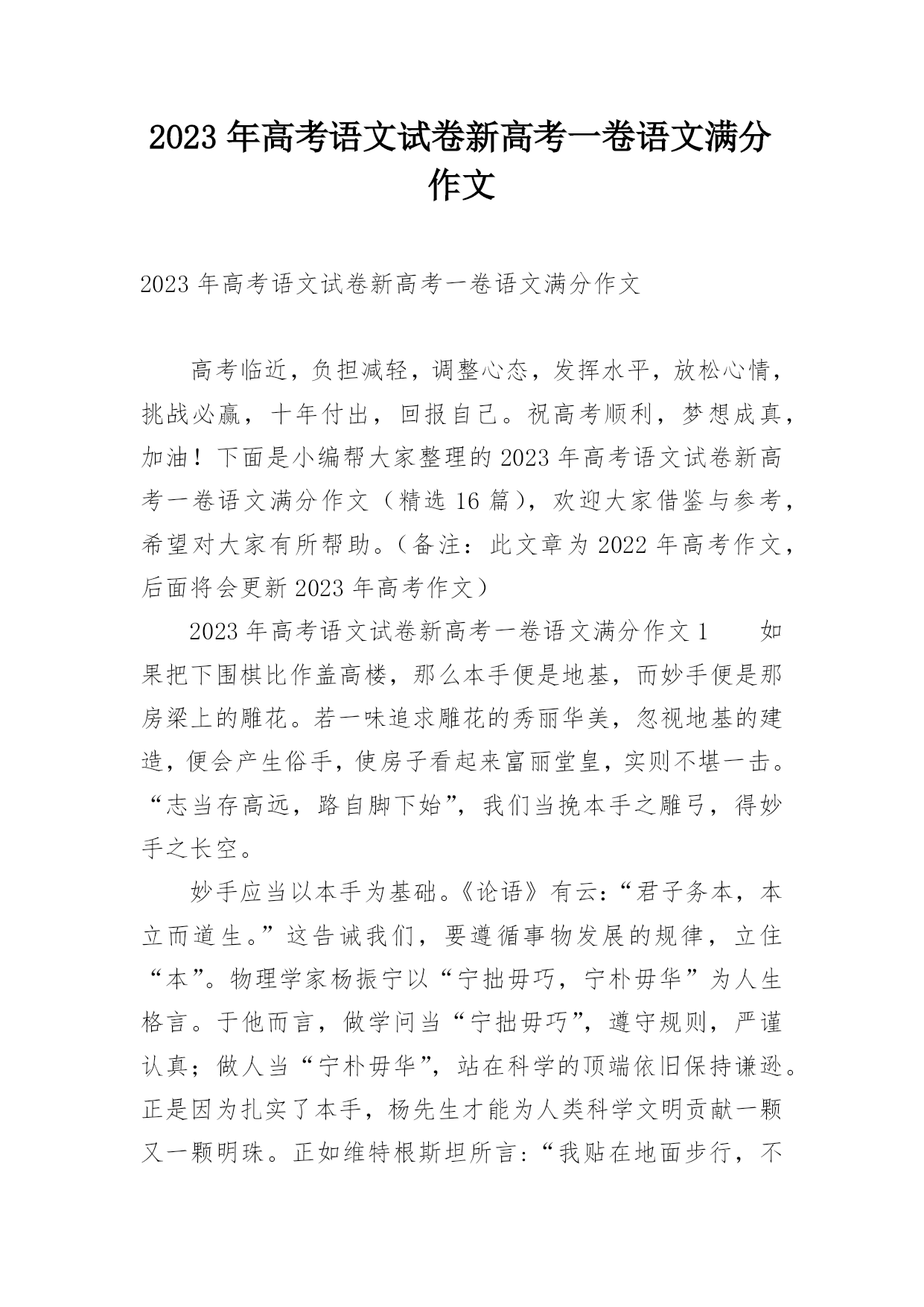 2023年高考语文试卷新高考一卷语文满分作文2023年高考语文试卷新高考一卷语文满分作文高考临近,负担减轻,调整心态,发挥水平,放松心情,挑战必赢,十年付出,回报自己。祝高考顺利,梦想成真,加油!下面是小编帮大家整理的2023年高考语文试卷新高考一卷语文满分作文(精选16篇),欢迎大家借鉴与参考,希望对大家有所帮助。(备注:此文章为2022年高考作文,后面将会更新2023年高考作文)2023年高考语文试卷新高考一卷语文满分作文1如果把下围棋比作盖高楼,那么本手便是地基,而妙手便是那房梁上的雕花。若一味追求