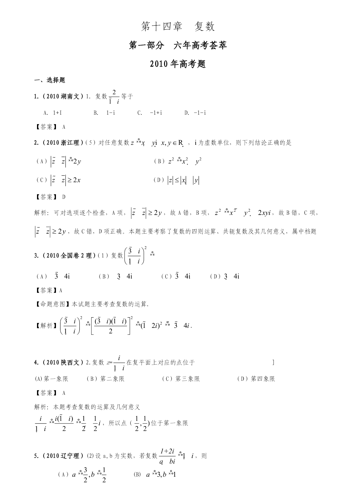 PAGE第十四章复数第一部分六年高考荟萃2010年高考题一、选择题1.(2010湖南文)1.复数等于A.1+IB.1-iC.-1+iD.-1-i【答案】A2.(2010浙江理)(5)对任意复数,为虚数单位,则下列结论正确的是(A)(B)(C)(D)【答案】D解析:可对选项逐个检查,A项,,故A错,B项,,故B错,C项,,故C错,D项正确。本题主要考察了复数的四则运算、共轭复数及其几何意义,属中档题3.(2010全国卷2理)(1)复数(A)(B)(C)(D)【答案】A【命题意图】本试题主要考查复数的运