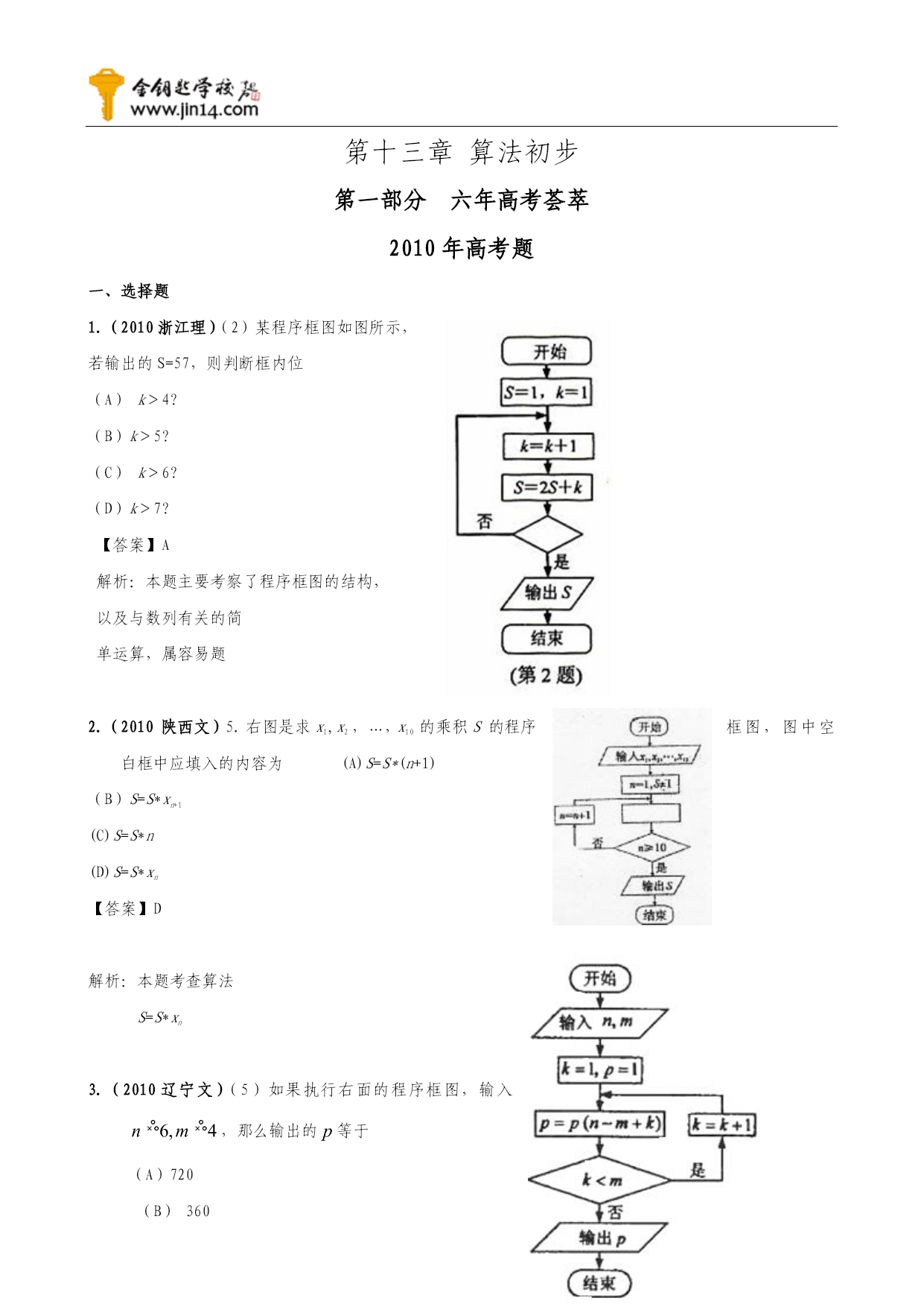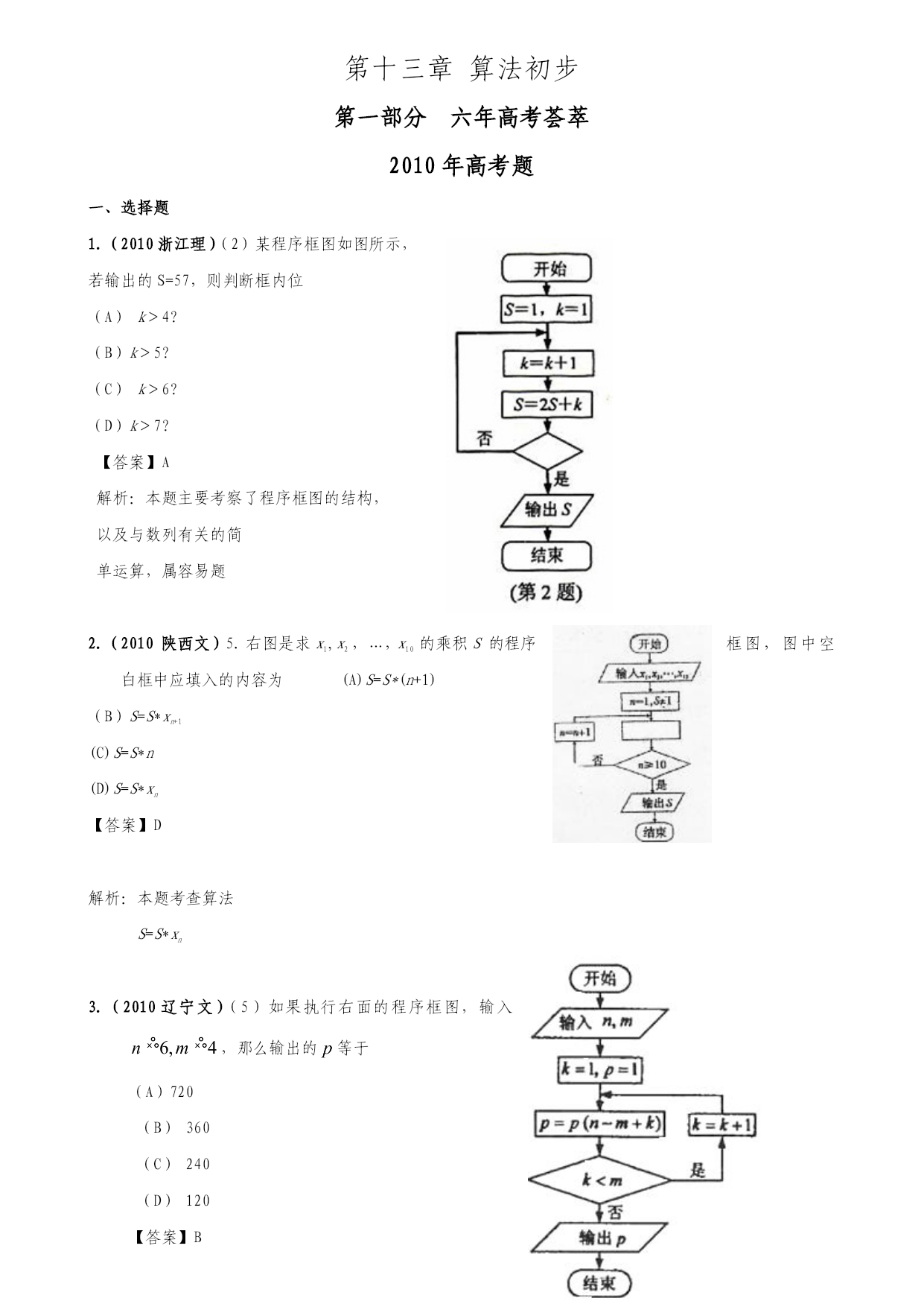 PAGE第十三章算法初步第一部分六年高考荟萃2010年高考题一、选择题1.(2010浙江理)(2)某程序框图如图所示,若输出的S=57,则判断框内位(A)k>4?(B)k>5?(C)k>6?(D)k>7?【答案】A解析:本题主要考察了程序框图的结构,以及与数列有关的简单运算,属容易题2.(2010陕西文)5.右图是求x1,x2,…,x10的乘积S的程序框图,图中空白框中应填入的内容为(A)S=S*(n+1)(B)S=S*xn+1(C)S=S*n(D)S=S*xn【答案】D解析:本题考查算法S=S*x