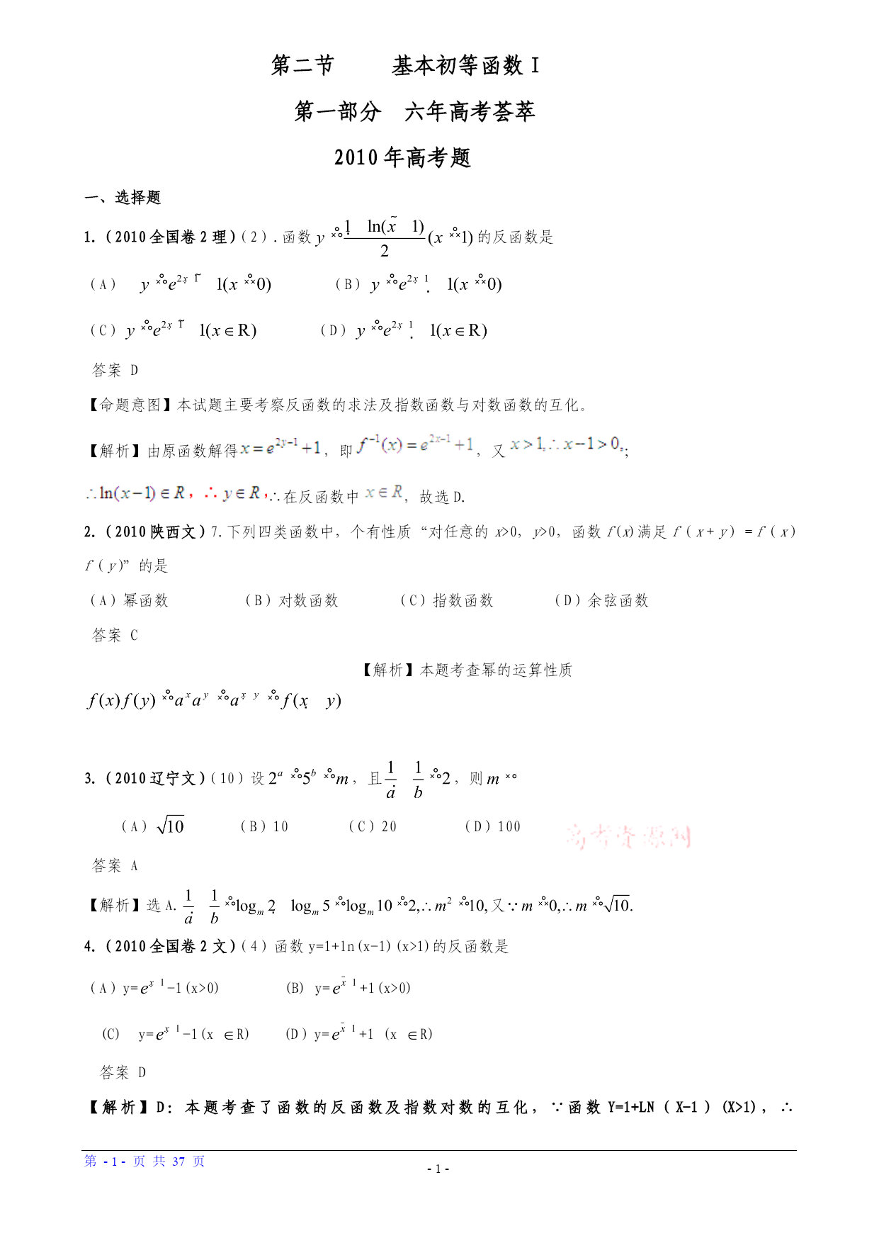 PAGEPAGE-37-第PAGE-37-页共NUMPAGES37页第二节基本初等函数I第一部分六年高考荟萃2010年高考题一、选择题1.(2010全国卷2理)(2).函数的反函数是(B)(C)(D)答案D【命题意图】本试题主要考察反函数的求法及指数函数与对数函数的互化。【解析】由原函数解得,即,又;∴在反函数中,故选D.2.(2010陕西文)7.下列四类函数中,个有性质“对任意的x>0,y>0,函数f(x)满足f(x+y)=f(x)f(y)”的是(A)幂函数(B)对数函数(C)指