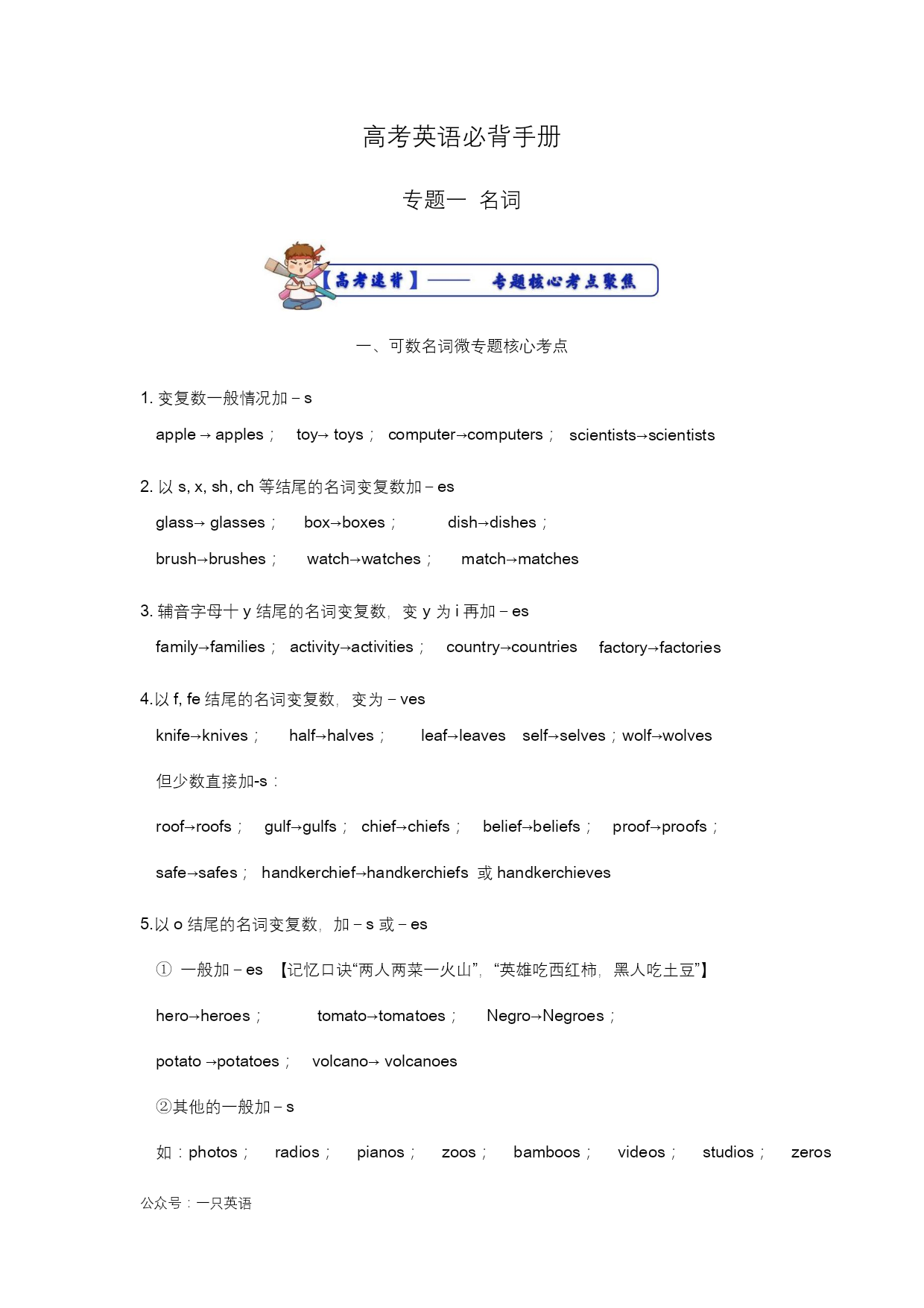 高考英语必背手册专题一名词一、可数名词微专题核心考点1.变复数一般情况加-sapple→apples;toy→toys;computer→computers;2.以s,x,sh,ch等结尾的名词变复数加-esscientists→scientistsglass→glasses;box→boxes;dish→dishes;brush→brushes;watch→watches;match→matches3.辅音字母十y结尾的名词变复数,变y为i再加-esfamily→families;activity→ac